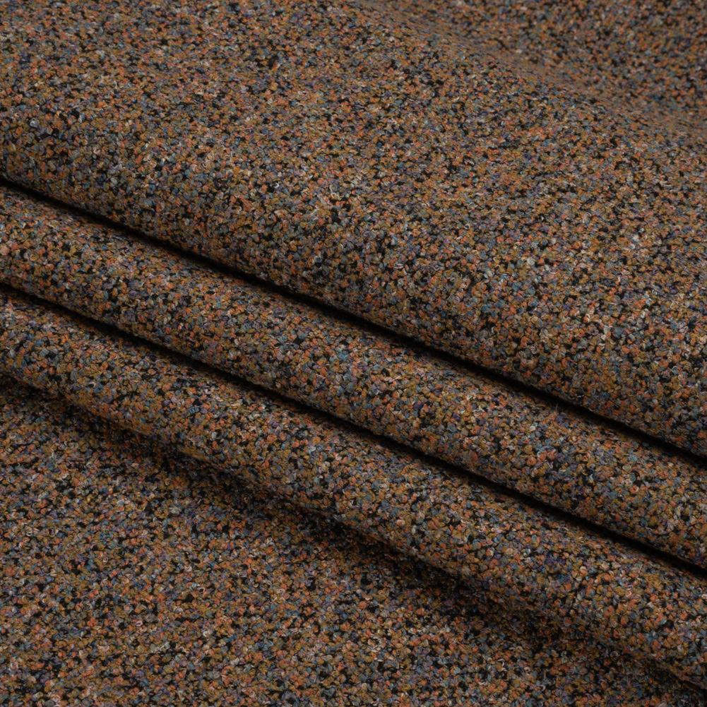 Discover the unique world of this Crypton Cinnabar Tweedy Stain Resistant Upholstery Boucle! The face is densely populated with small mustard yellow, purple, black, blue, and white dots, creating a soft and pebbly hand that feels similar to a tweed.
