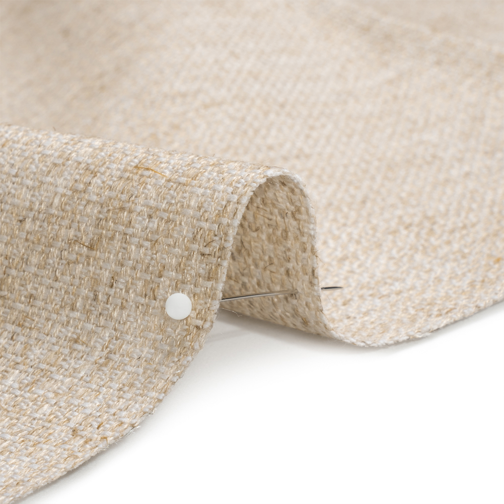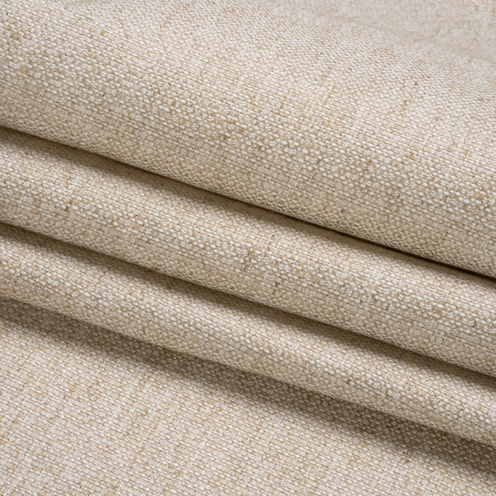 Bring your style down to earth with this Crypton Flax Rayon and Linen Heavyweight Basket Woven. The visible weave modestly brings texture into your home, effortlessly evoking a rustic feel while displaying a subtle sheen across the cream and tan face. Perfectly paired with natural woods or beachy hues, this simple style offers a solid foundation to build with colors and textures. The pebbly, slightly fuzzy hand and semi-structured drape offer themselves to ottomans, headboards, barstool covers, and more. Semi-translucent, a lining will increase durability and opacity.