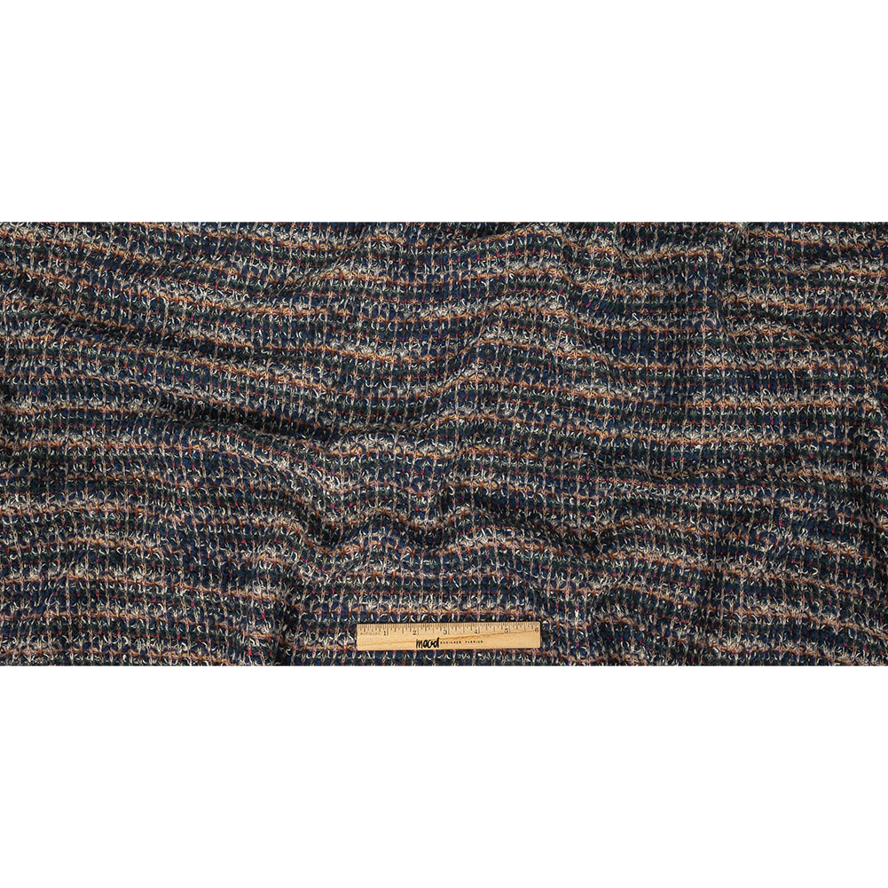 Aptly named, our Dark Forest, Navy, and Beige Striated Chunky Wool Knit is made for exploring! Highly textured in the style of your favorite movie-watching blanket and perfectly balanced by tight threads holding down excited boucled springs, this fabric presents a heavy but malleable drape.