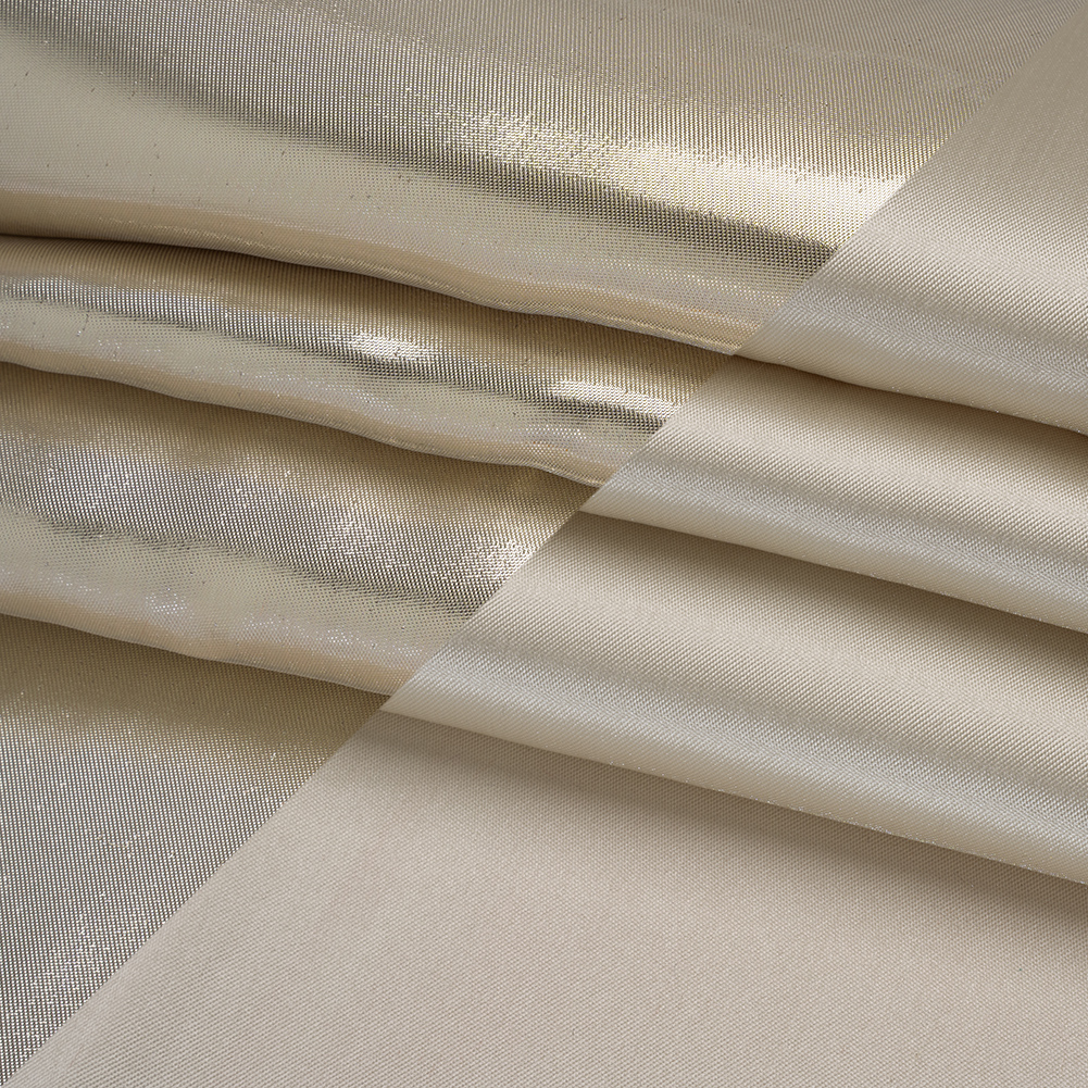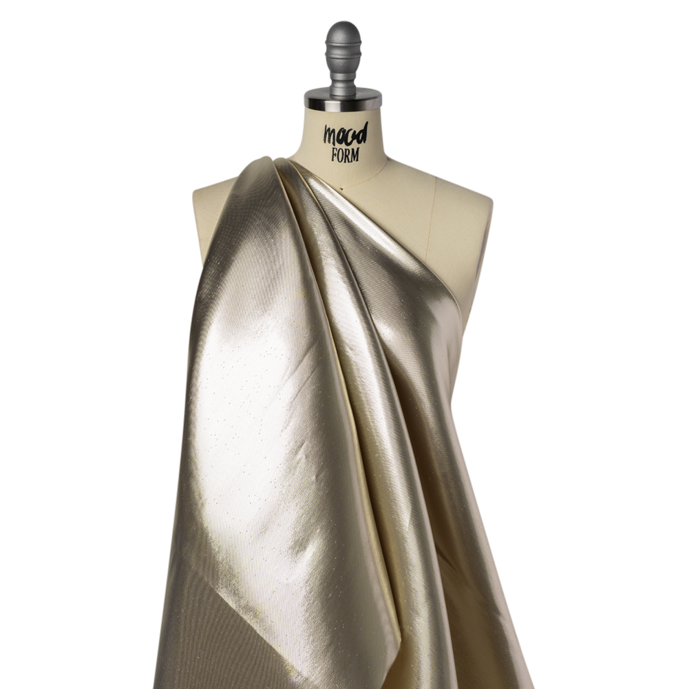 Spin designs meant for the moonlight out of this Ivory Double Faced Lame Mikado—featuring a sleek hand and structured drape.Suggested Projects: Gowns, Jackets, Skirts, SuitsContent: 85% Polyester, 15% LurexStretch: NoneOpacity: OpaqueCapture the magic of the witching hour when working with this lame mikado. Double-sided and dazzling, one face shimmers in metallic pale gold while the reverse glows in luminous ivory—perfect for eveningwear that demands attention. With a sleek hand and structured drape, it transforms effortlessly into crisp suit sets, sculpted evening gowns, tailored jackets, and voluminous circle skirts. Fully opaque, a lining can be added for a polished finish, though it isn’t strictly necessary.