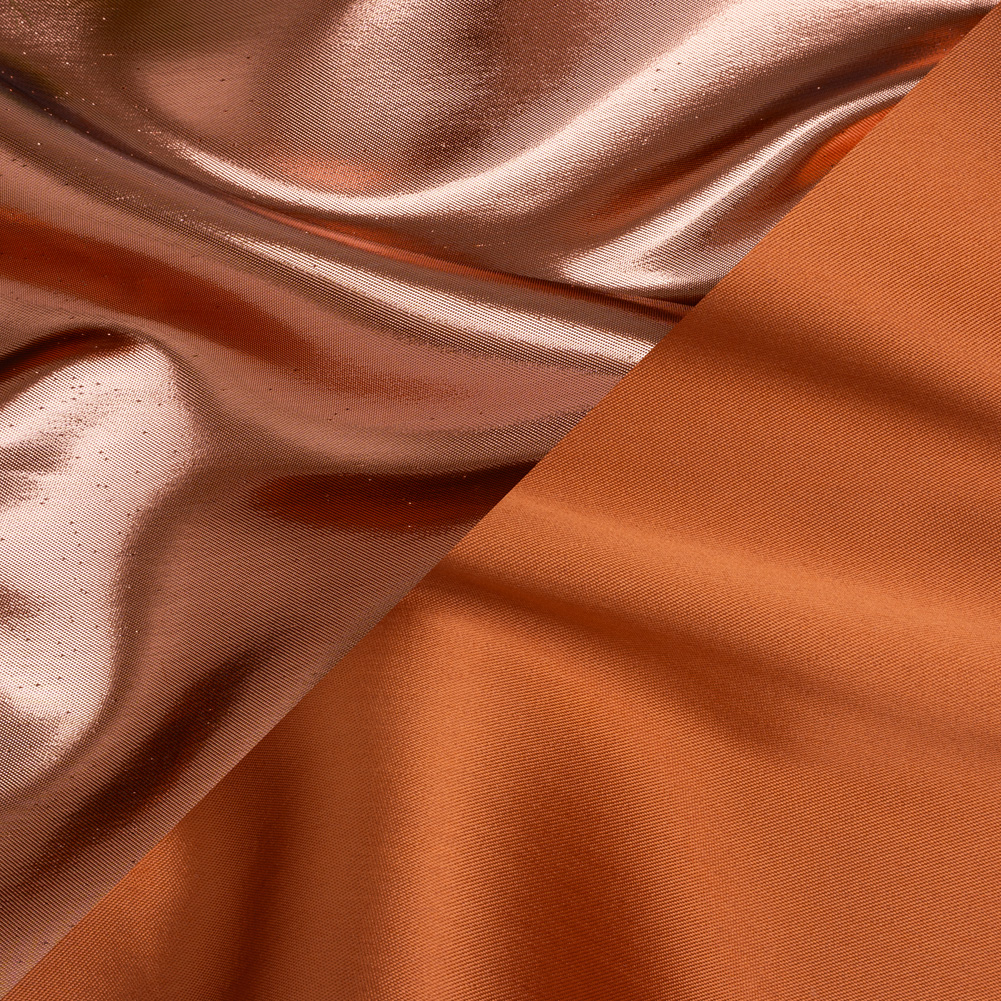 No need to leave the ball early when you’re wearing this Pumpkin Orange Double Faced Lame Mikado—featuring a sleek hand and structured drape.Suggested Projects: Gowns, Jackets, Skirts, SuitsContent: 85% Polyester, 15% LurexStretch: NoneOpacity: OpaqueHarvest untold elegance with this lame mikado. Double-sided and dazzling, one face shimmers in metallic copper orange while the reverse glows in luminous pumpkin orange—perfect for eveningwear that demands attention. With a sleek hand and structured drape, it transforms effortlessly into crisp suit sets, sculpted evening gowns, tailored jackets, and voluminous circle skirts. Fully opaque, a lining can be added for a polished finish, though it isn’t strictly necessary.