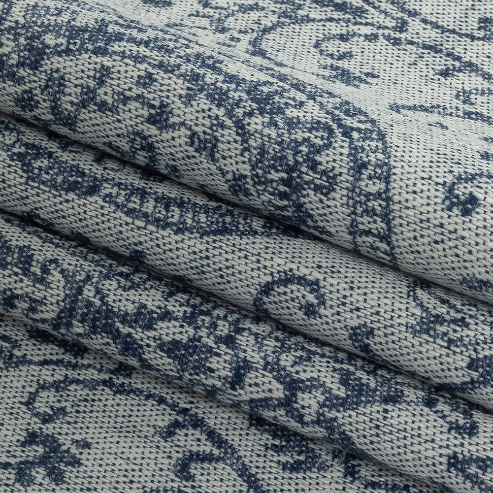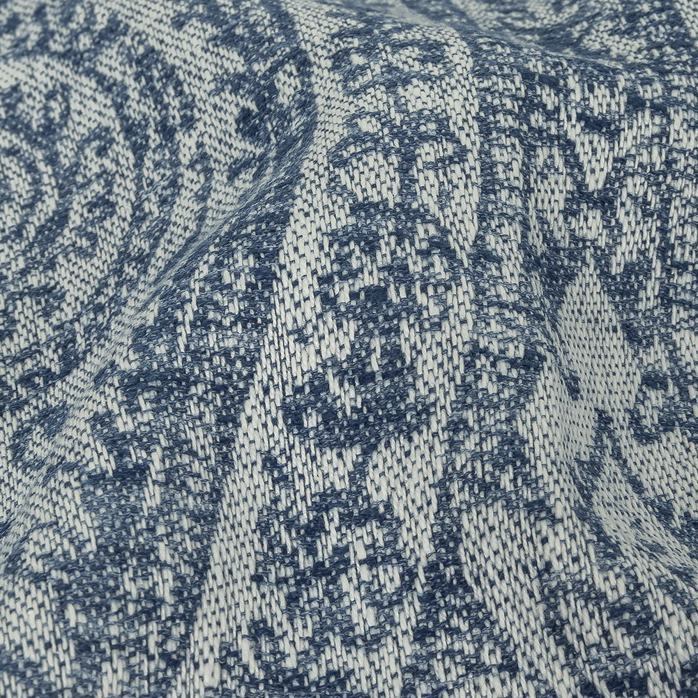 Curlicues of navy lovingly invade this warm denim background to bring you our British Imported Danube Damask Drapery Jacquard. Associated with refinement and royalty, the damask patterning on this intricate woven features delicate curls and heavily stylized floral motifs arranged into a lozenge-shaped repeat reminiscent of the designs of a traditional silk damask, but is updated with a matte finish and soft, lightly textured cottony hand. Featuring a relaxed but ultimately heavy, supple drape, we don't think you'll have a problem working this classic pattern into your home. Craft regal drapery that seemingly pours from your ceiling, shorter curtains that punctuate your kitchen and bathroom with Byzantine-era detailing, or take on smaller projects like reupholstering a headboard or making a small throw pillow. Though almost entirely opaque, we do recommend a lining for a polished finish.Note: This fabric, in particular, can be machine washed up to temperatures of 40 degrees Celsius and can be tumble dried on the lowest heat setting. Do not bleach this material. This fabric can be dry cleaned with any solvent except tetrachlorethylene.