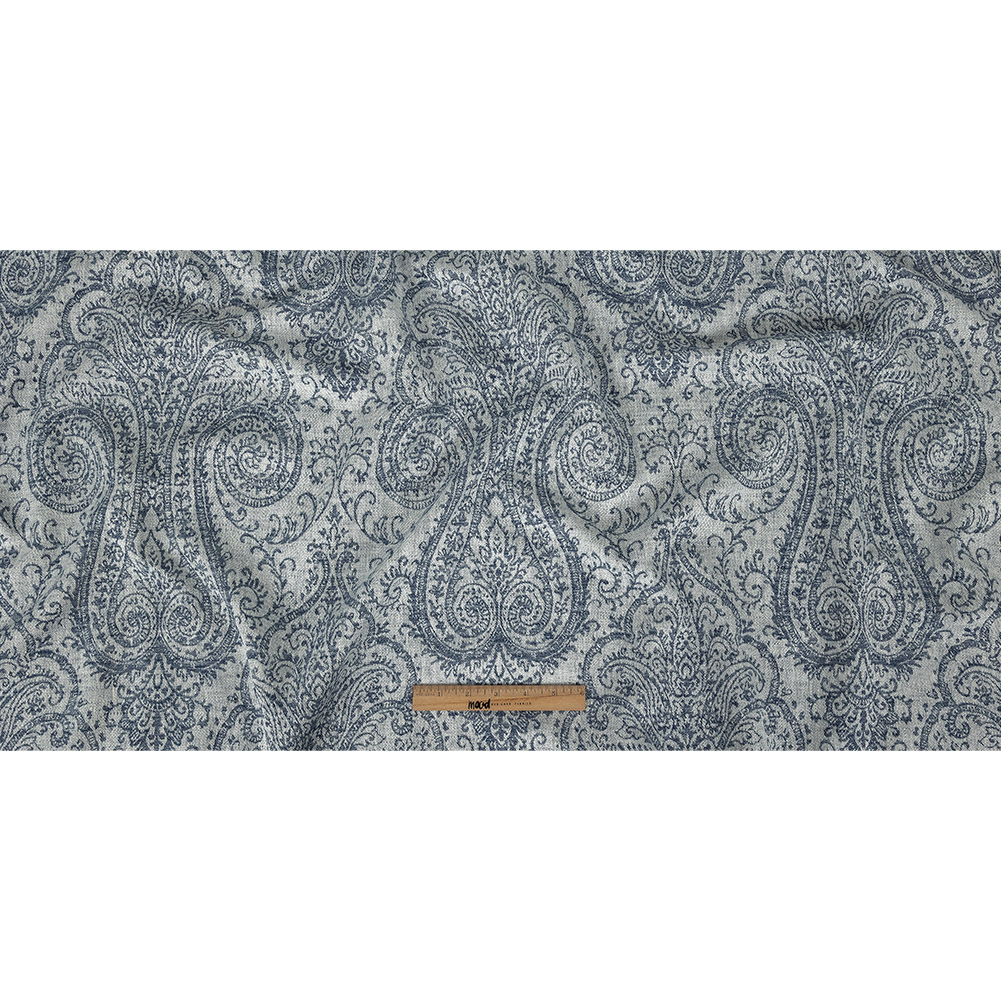 Curlicues of navy lovingly invade this warm denim background to bring you our British Imported Danube Damask Drapery Jacquard.
