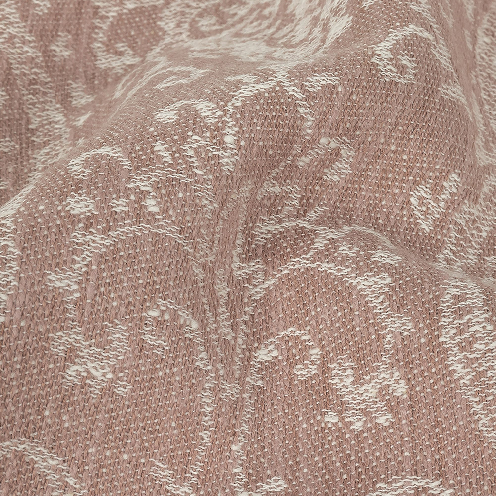 The perfect shade of pink for year-round use, our British Imported Dusky Pink Damask Drapery Jacquard will imbue your home with softness and fun. Associated with refinement and royalty, the damask patterning on this intricate woven features delicate curls and heavily stylized floral motifs arranged into a lozenge-shaped repeat reminiscent of the designs of a traditional silk damask, but is updated with a matte finish and soft, lightly textured cottony hand. Featuring a relaxed but ultimately heavy, supple drape, we don't think you'll have a problem working this classic pattern into your home. Craft regal drapery that seemingly pours from your ceiling, shorter curtains that punctuate your kitchen and bathroom with Byzantine-era detailing, or take on smaller projects like reupholstering a headboard or making a small throw pillow. Though almost entirely opaque, we do recommend a lining for a polished finish.Note: This fabric, in particular, can be machine washed up to temperatures of 40 degrees Celsius and can be tumble dried on the lowest heat setting. Do not bleach this material. This fabric can be dry cleaned with any solvent except tetrachlorethylene.