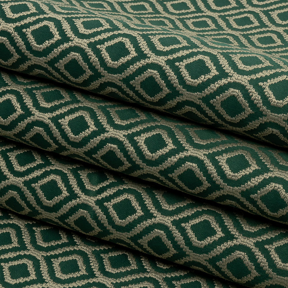 Enjoy a bohemian styling with this British Imported Emerald Simple Ogees Drapery Jacquard. An emerald green ground with a luminous sheen is topped with an interlocking rounded diamond-like pattern in beige, and the Jacquard weave structure gives it a tactile, embroidery-like feel. With a flexible drape and no stretch, create dramatic drapes and long, pooling curtains, elegant swags and valances, or even light upholstery projects like throw pillows and upholstered headboards. If desired, a lining can be added to lessen sun damage, but it's not needed for most projects.