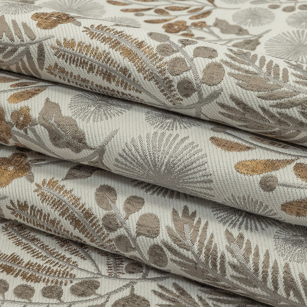 Go for the gold with this British Imported Gold Foliage Drapery Jacquard! A cross between Art Nouveau and Mid-Century Modern design styles, abstract foliage blossoms in metallic gold and silver over a light gray ground. Pliable and semi-fluid in drape, craft statement drapery for living rooms, bedrooms, or a home library. This jacquard does let some light through, so add a lining if full opacity is desired.