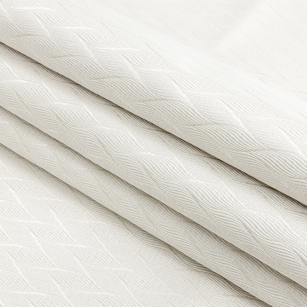 You won’t be-leaf how shimmeringly bright this British Imported Ivory Leafy Jacquard is! Narrow leaf shapes fall into patterns of rolling waves with a luminous sheen, peaceful and turbulent in equal turn.