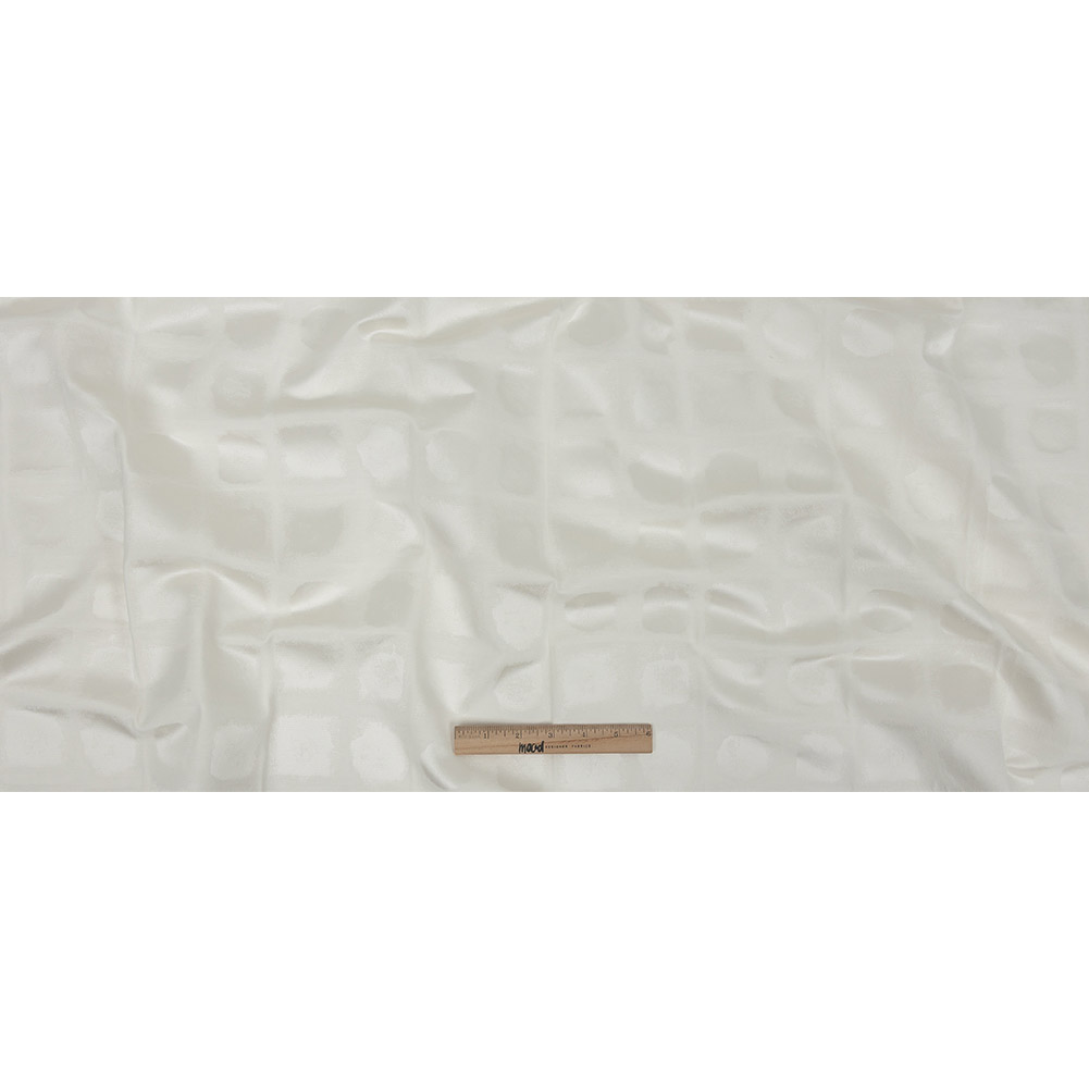 Shade your room from the heat of the sun without making things dark with this British Imported Ivory Painterly Squares Drapery Jacquard! Shimmering painterly off-white squares are bordered in matte cream, creating the optical illusion of a dimensional look, even on its flat surface. The reverse side shows the pattern in inverse colors. Crisp and silky in hand, this Jacquard features a voluminous drape that's ideal for statement window treatments. Craft curtains fit for a king or hang valances that frame not only your windows but your whole room! Even light upholstery and home decor accessories are well within the realm of possibilities. When making curtains and drapery, a drapery lining may be useful to block additional light as well as protect the fabric from sun damage and fading, particularly in sunnier locations. Cleaning Instructions: This fabric can be dry cleaned with any solvent except tetrachlorethylene or machine washed with a maximum temperature of 40° Celsius. This fabric can be tumble dried on a low heat setting. Do not iron or bleach this material.