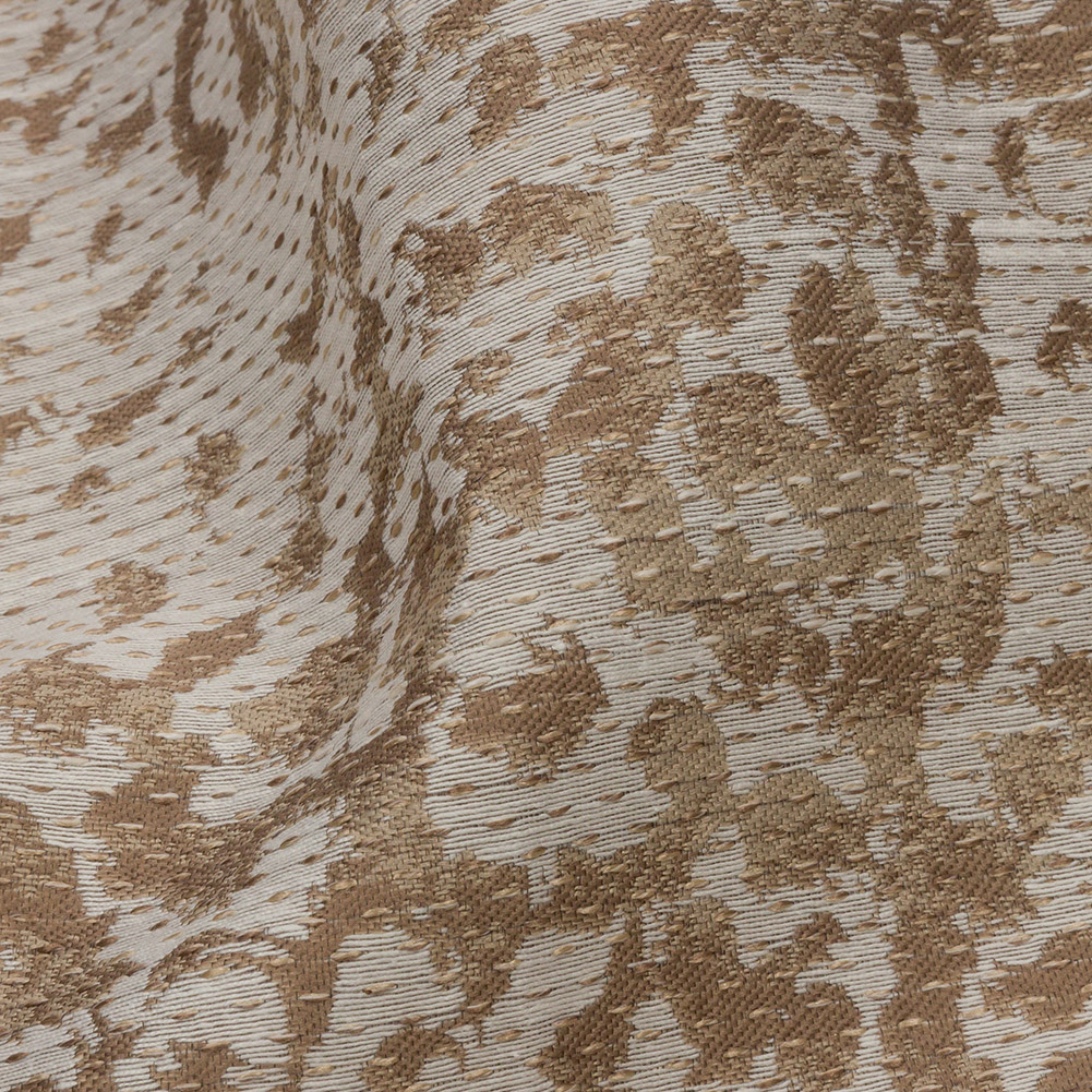 Waltzing through the wild wetlands, this British Imported Jute Spectacular Spots Drapery Jacquard shimmers under the hot sun. This supple fabric muses over the luxurious coat of a cheetah, presenting a vague collection of tan spots, against a beige background, that is reminiscent of the grassland cat. With a less distinct display of animal print, it is easy to introduce patterns with character to your home. The hand is sleek yet slightly tactile, textured by the complex Jacquard weave. Create floor-to-ceiling curtains, wild valances, statement drapes, and more! Mostly opaque, a lining may be necessary for a complete black-out effect.