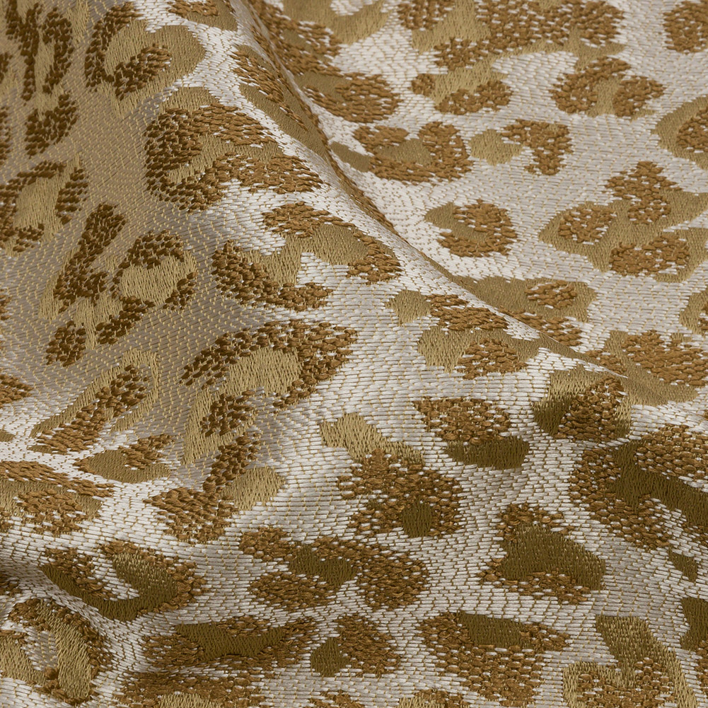 Who knew the wild side could be as glamorous as this British Imported Sand Leopard Spots Drapery Jacquard!? Gold and beige leopard spots decorate the silver base, with the Jacquard weave structure giving it a tactile, embroidery-like feel.