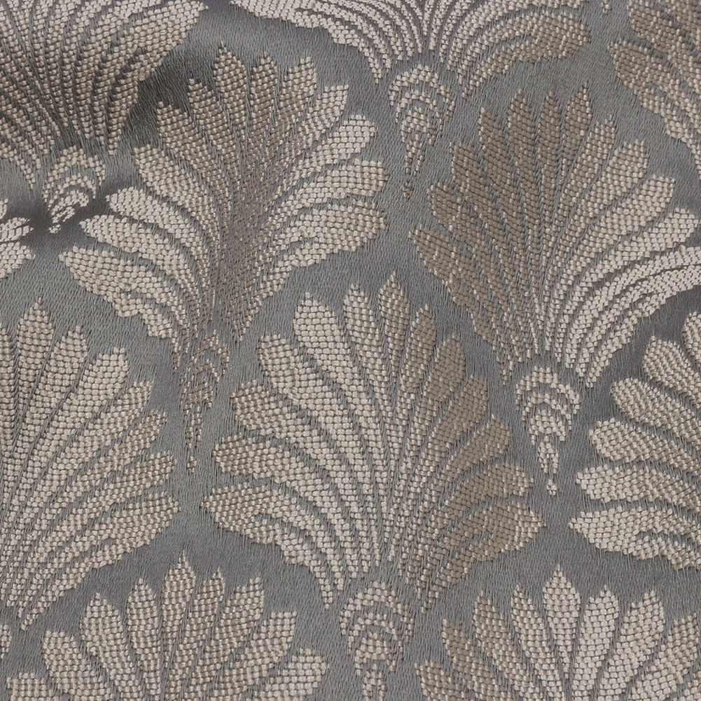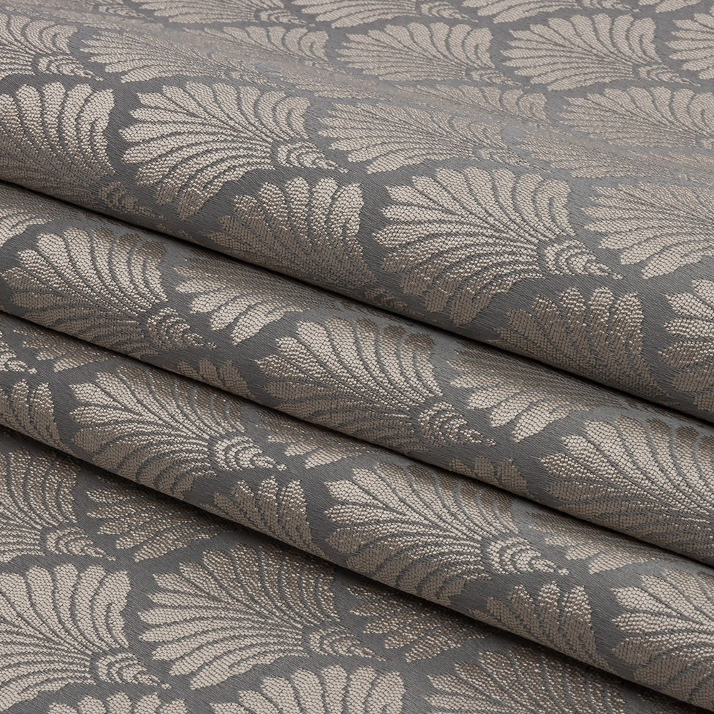 Deep in the shadows, luxury is lurking. Discover it with this British Imported Shadow Palm Fans Drapery Jacquard. Fanned-out tan palm leaves decorate a lustrous base of dark gray. The Jacquard weave structure gives the face a tactile, embroidery-like feel and an undeniable sense of sophistication. With a flexible drape and no stretch, create dramatic curtains, elegant valances, or even light upholstery projects like throw pillows and upholstered headboards. Fully opaque; if desired, a lining can be added to lessen sun damage, but it's not needed for most projects.