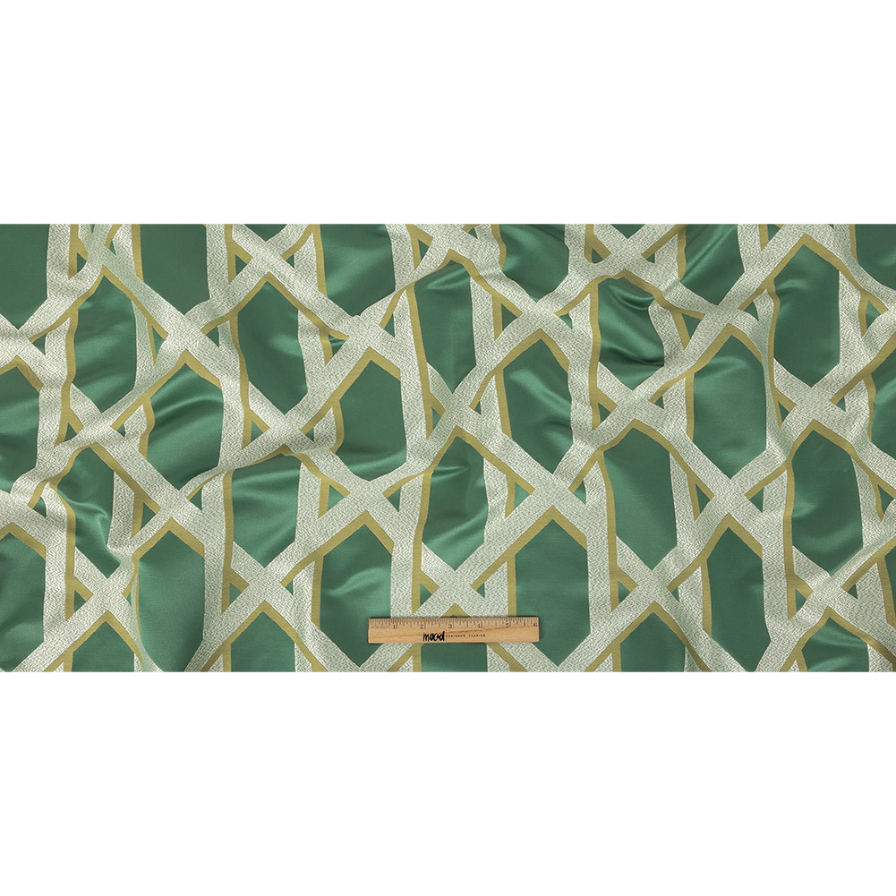 Bring home this British Imported Spa Lattice Drapery Jacquard for a boldly relaxing update to your decor. With a bright sheen all across, this geometrically patterned Jacquard features a satin-faced ocean green ground crisscrossed by a latticework of finely pebbled cream with twill-faced drop shadows in sage green for a dimensional finish. With a regally voluminous drape, craft stately curtains for formal living rooms, complete with valances or swags for a truly opulent effect. Opaque, a lining isn't necessary for most projects.
