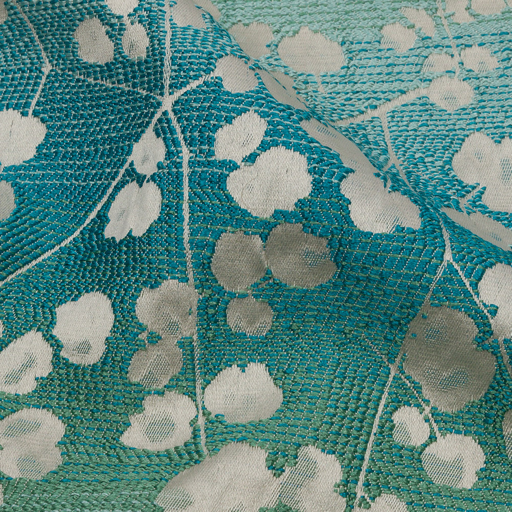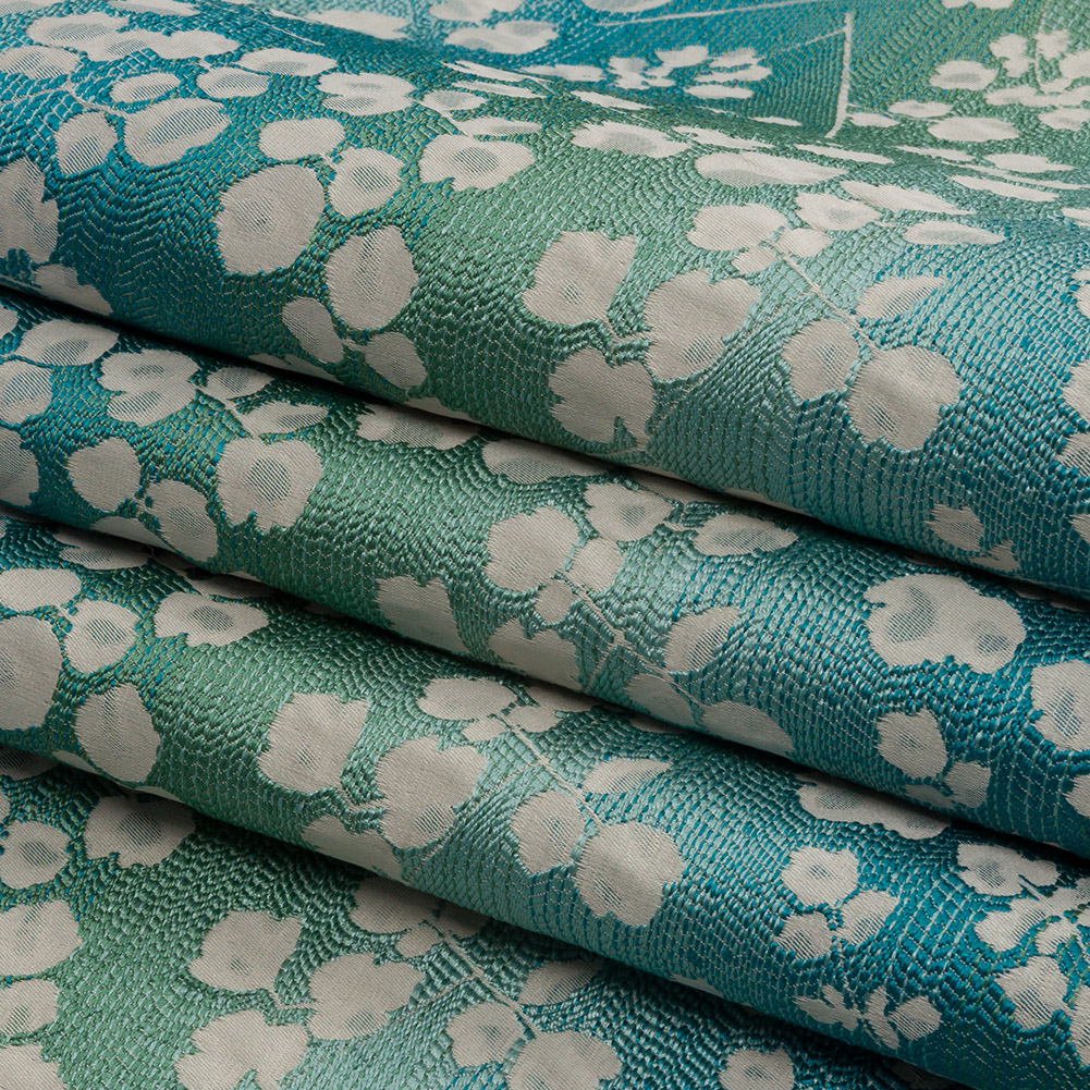 Get the look of a early spring day in your home with this British Imported Verdigris Ombre Stripes and Little Flowers Drapery Jacquard. On a blue-to-aqua ombre base, displaying a luminous sheen, little white flowers bud on branches. The Jacquard weave structure gives the face a tactile, embroidery-like feel. With a flexible drape and no stretch, create billowing drapes and long, pooling curtains to brighten up your living room. Add elegant swags and valances to kitchen and dining rooms, or upholster throw pillows and headboards. Completely opaque; a lining can be added to lessen sun exposure but is not needed for most projects.