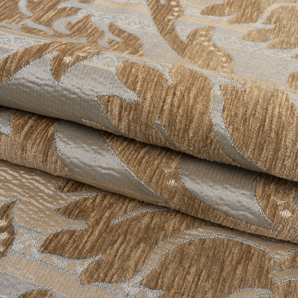 This is a synthetic blend in lustrous duck egg blue with driftwood brown chenille. This fabric has a damask pattern and can be reversible. Great for larger Upholstery or heavier drapes.