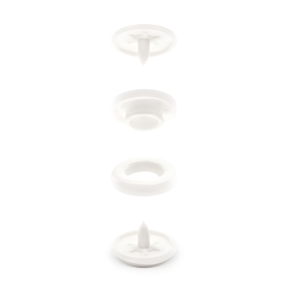 Close your designs with a snap using these Dritz White Plastic Round Snaps. Each pack includes 12 sets of ½” white plastic snaps, with each set containing a round cap, socket, and stud. Designed for use with the Dritz Plastic Snap Pliers (sold separately), they’re ideal for fastening adult garments and accessories—and are safe and secure enough for children’s items, too!