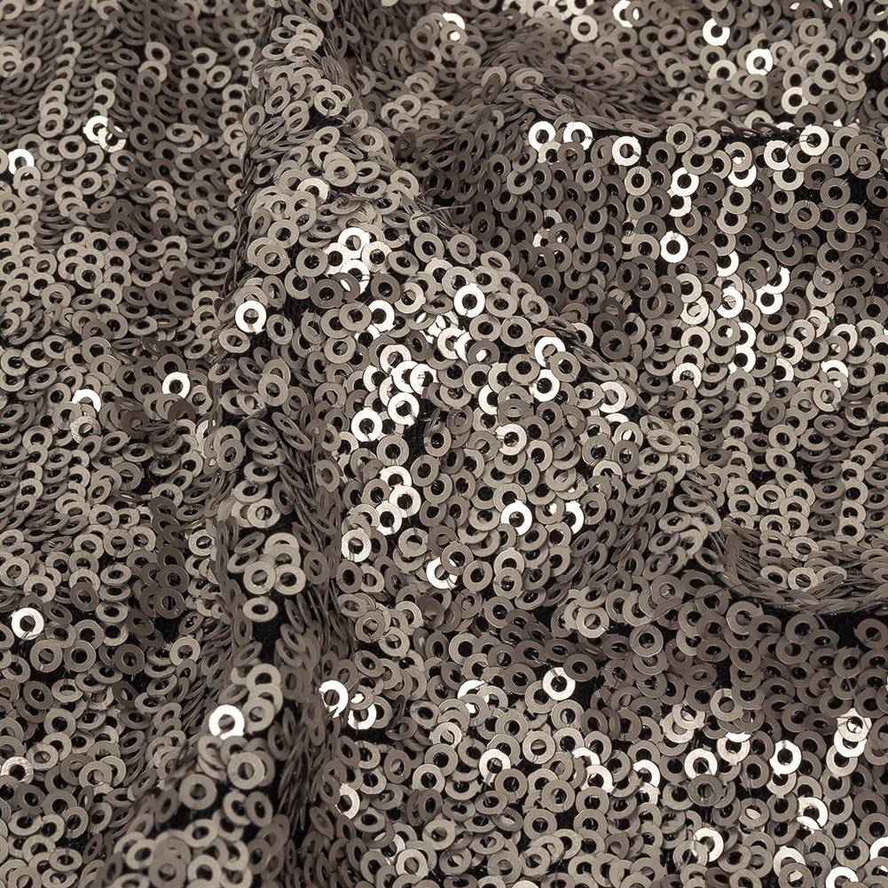 Find the fabulosity you seek-quin in this Dull-Polished Silver All-Over Baby Sequin Fabric! Minute silver sequins take on a pearly hue as they spread in random configurations across a black mesh with a 75% stretch through the weft and 50% stretch through the warp. With a supple drape, add an elegantly glittering element to sensational evening gowns, create dance or skating costumes, or dress up your wardrobe with jackets, headbands, and blouses! Rendered opaque by the densely packed sequins, a lining is still recommended for comfort in wear and additional structure where required.