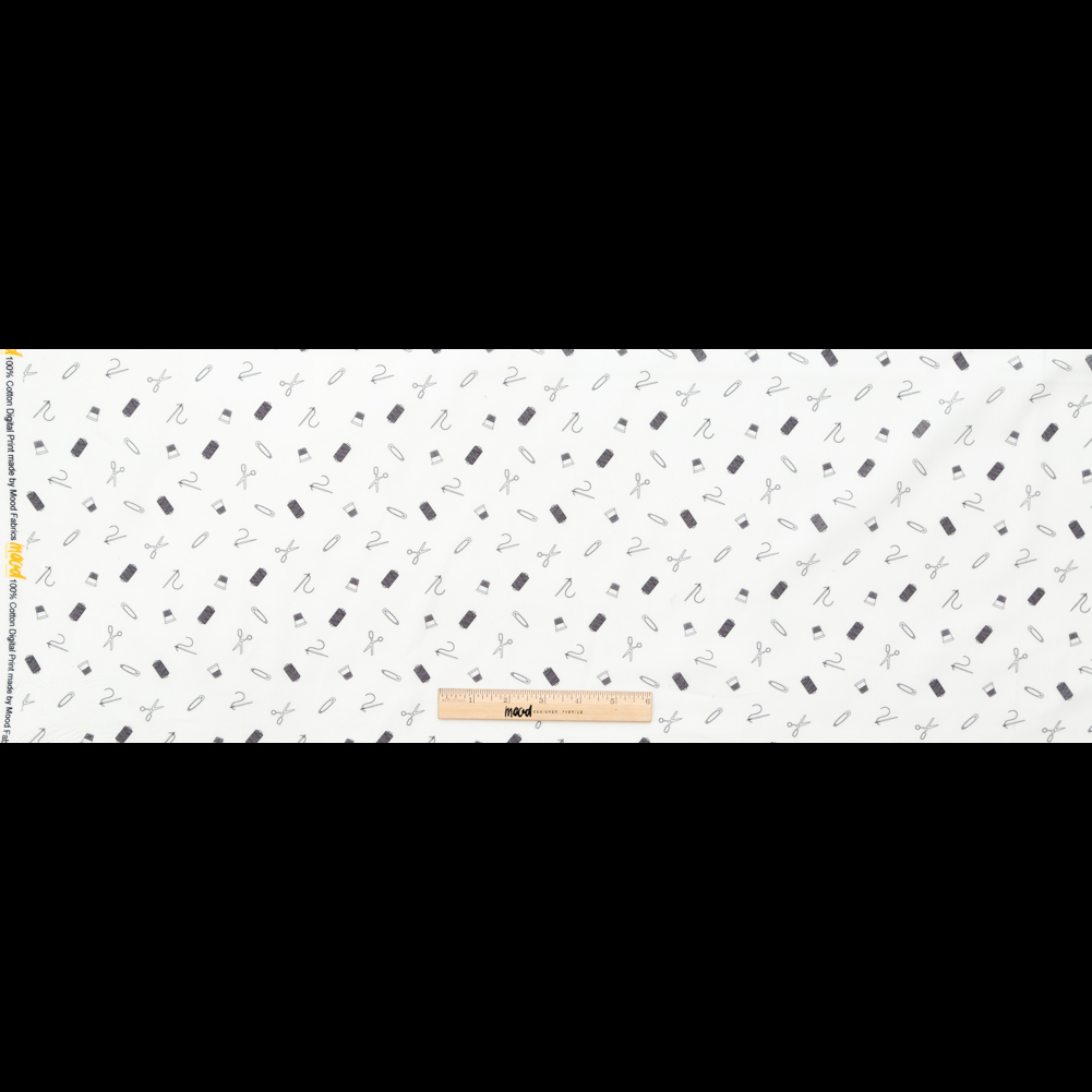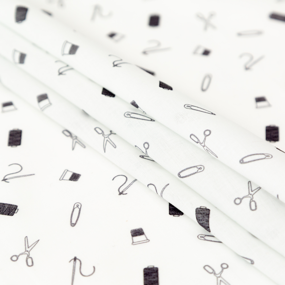Scissors and thimbles and needles, oh my! With our Mood Exclusive White and Black Small Supplies Mercerized Cotton Voile, you’ll witness thread and safety pins too! Mercerized cotton fabrics are far from basic as they are finished with a special chemical treatment that increases luster, dye absorption, and tear strength while reducing fabric shrinkage.