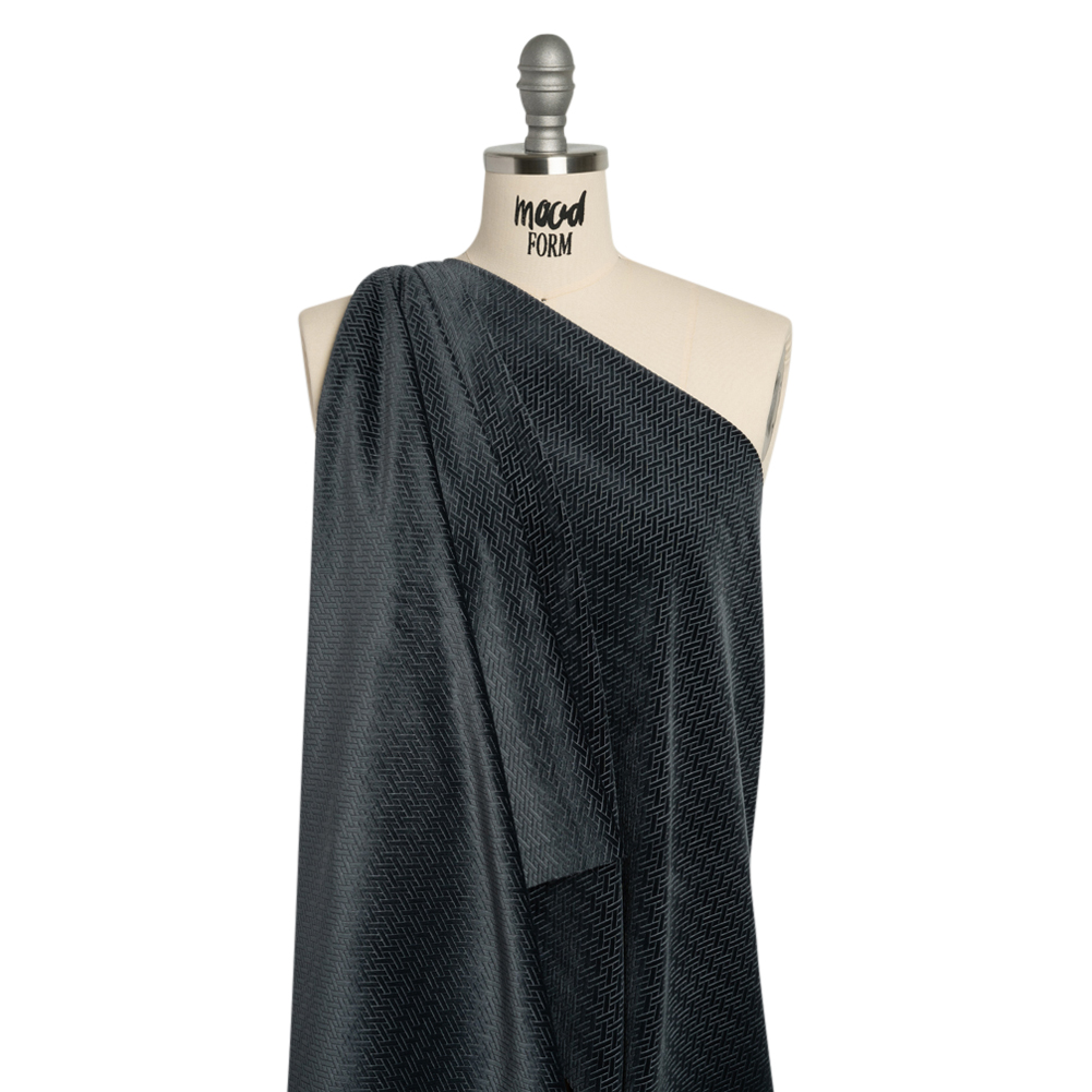 A luxurious dream for the senses, this Gray Embossed Polyester Velvet features a plush hand, fluid drape, and light weight—perfect for stunning evening attire.