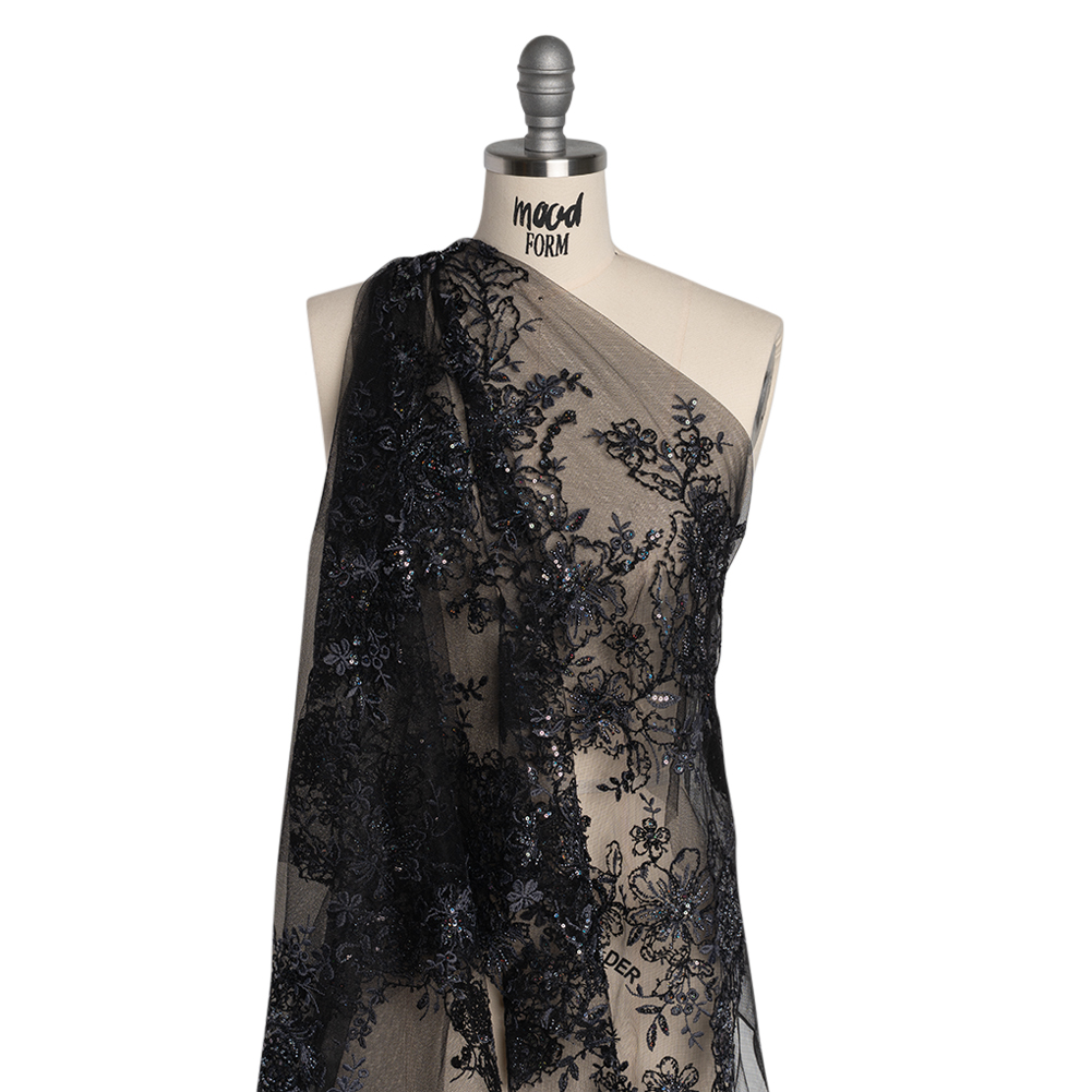 Master moody ensembles with this Black and Gray Rose Garden Embroidered and Beaded Lace with Holographic Sequins—featuring a tactile hand and voluminous drape.Suggested Projects: Dresses, Skirts, Tops, OverlaysContent: 30% Nylon, 28% Viscose, 26% Cotton, 16% RayonStretch: Weftwise Mechanical GiveOpacity: SheerA moody rose garden blooms across this black lace, its petals stitched in smoky shades of black and gray, each bloom catching the light with glints of beads and holographic sequins for a touch of dark enchantment. Soft and tactile to the touch, this lace offers a voluminous drape and slight weftwise give, making it a luxurious choice for dream dresses, ethereal blouses, fitted tops, or as a dazzling overlay for elegant eveningwear. Sheer by nature, it pairs beautifully with a lining or a layered design.