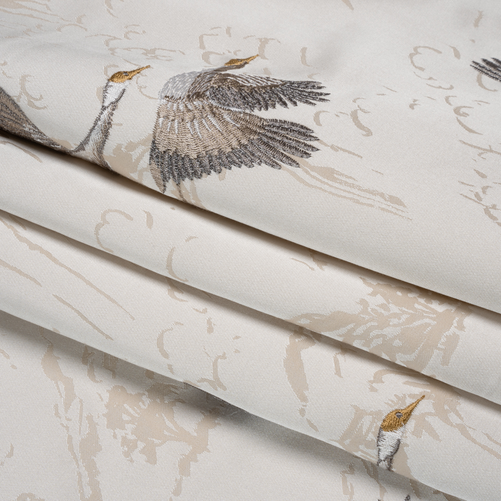 Embroidered Cotton and Polyester Drapery Jacquard – Pale Dove Cranes in the Clouds – British Imported