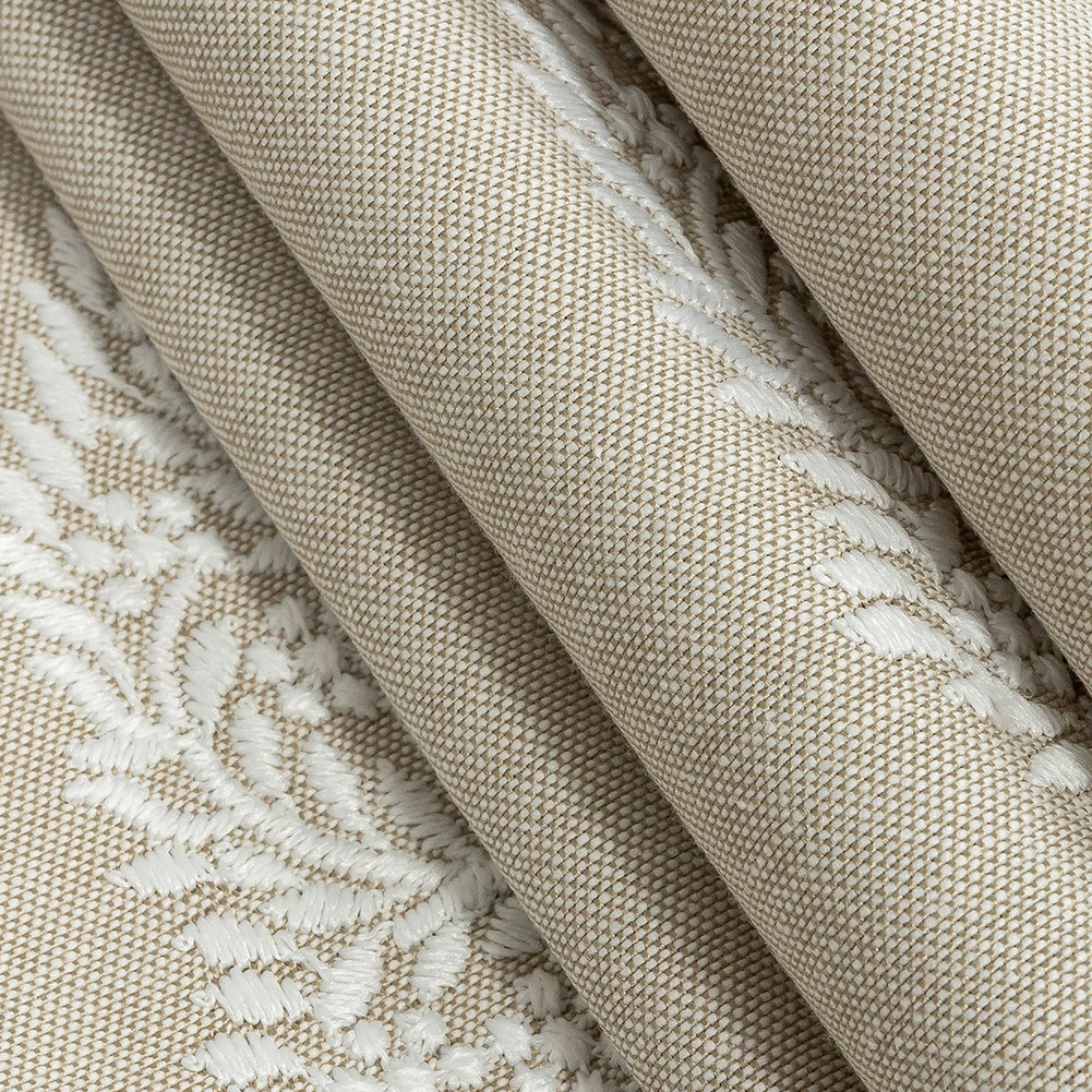 Use the neutral colors of this British Imported Linen Foliage Embroidered Drapery Woven to help achieve your vision of the perfect space! Soft and smooth in hand, its simplistic, textured design boasts a series of idyllic trees atop a light taupe background, altogether providing a subtle luster throughout. Lightweight and without stretch, take advantage of its relaxed, flexible drape to quell any and all of your drapery needs. Replace out of date curtains and drapes in any room to give your home a more welcoming atmosphere. Translucent, a drapery lining may be desired for added sun-blocking capabilities and protection from fading. One should take into account that although measuring 59" in width from selvage to selvage, it is recommended that only 53" across be used for the best results. Cleaning Instructions: This fabric can be dry cleaned with any solvent except tetrachlorethylene or machine washed with a maximum temperature of 30° Celsius. Do not tumble dry or bleach this material. This fabric can be ironed on a low heat setting.