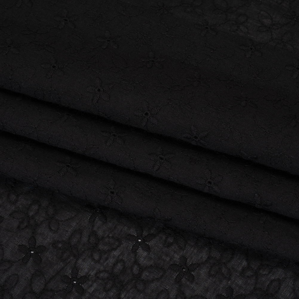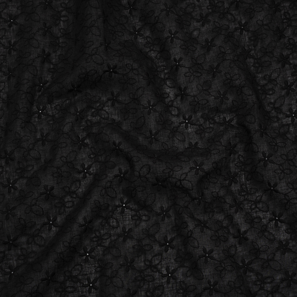 Enjoy dinner on the patio amidst the setting sun and chirping crickets in this Black Daisies and Leaves Embroidered Eyelet Cotton Voile—featuring a dry, tactile hand and crisp, airy drape.Suggested Projects: Shirts, Skirts, Dresses, ShortsContent: 100% CottonStretch: NoneOpacity: TranslucentEmbroidered daisies and leaves bloom atop this black cotton voile. Derived from the French word for veil, voile has a history of gracing romantic occasions with its ethereal sheerness and airy drape. With a dry, tactile hand and crisp yet airy drape, it easily navigates the space between elegance and simplicity. Made from 100% cotton, this naturally breathable fabric is the perfect choice for breezy spring and summer garments—its eyelets further helping you stay cool under the sun. Use it to craft summer dresses, flowing blouses, skirts, tiered maxi skirts, and more! Translucent, a lining may be desired.