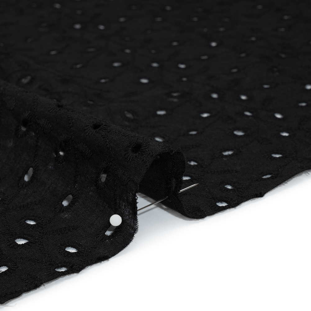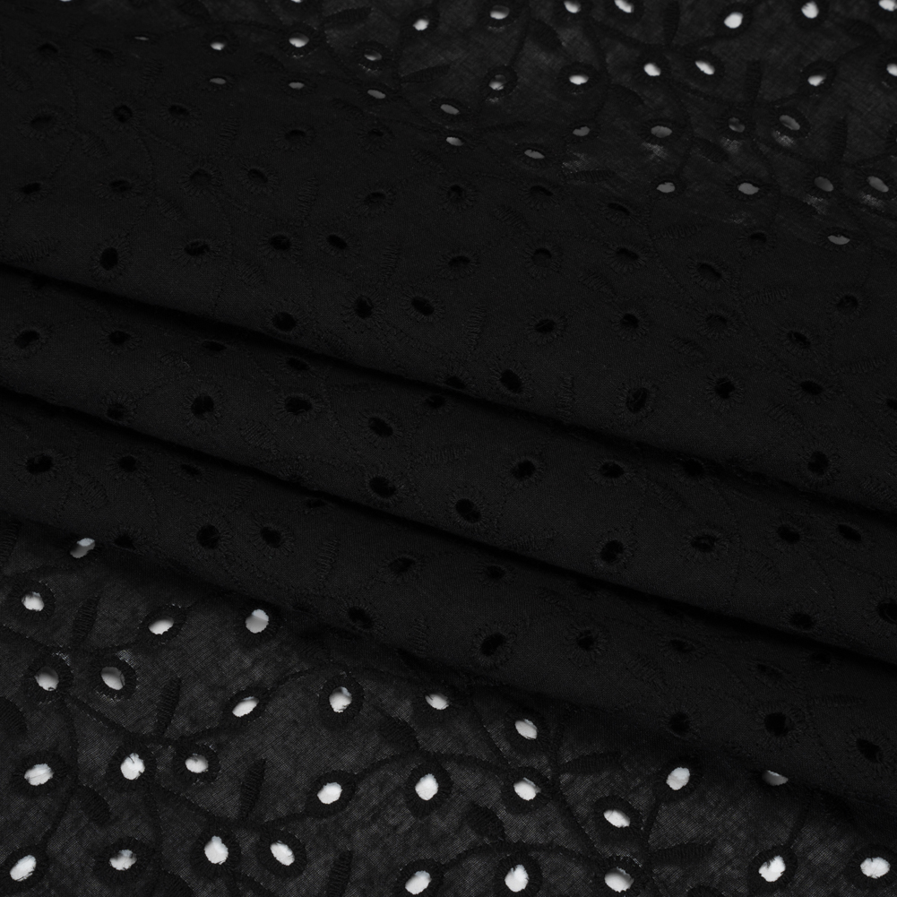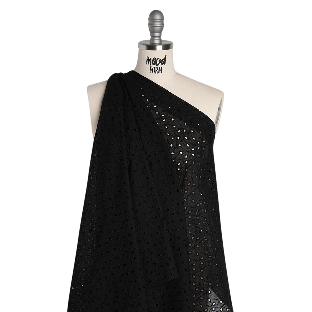 Discover adventures exploring long forgotten estates in this Black Leafy Vines Embroidered Eyelet Cotton Voile—featuring a dry, tactile hand and crisp, airy drape.Suggested Projects: Shirts, Skirts, Dresses, ShortsContent: 100% CottonStretch: NoneOpacity: TranslucentEmbroidered leafy vines climb across this black cotton voile. Derived from the French word for veil, voile has a history of gracing romantic occasions with its ethereal sheerness and airy drape. With a dry, tactile hand and crisp yet airy drape, it easily navigates the space between elegance and simplicity. Made from 100% cotton, this naturally breathable fabric is the perfect choice for breezy spring and summer garments—its eyelets further helping you stay cool under the sun. Use it to craft summer dresses, flowing blouses, skirts, tiered maxi skirts, and more! Translucent, a lining may be desired.
