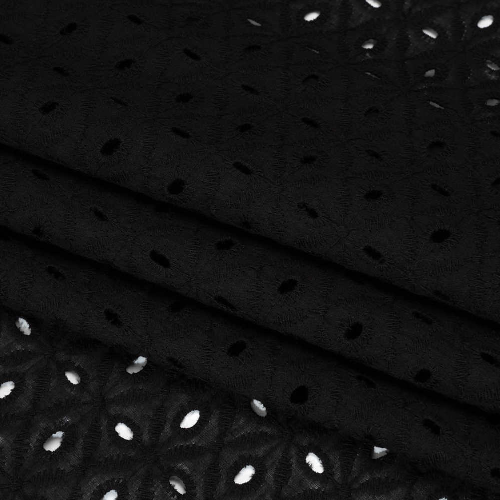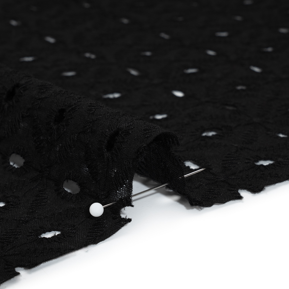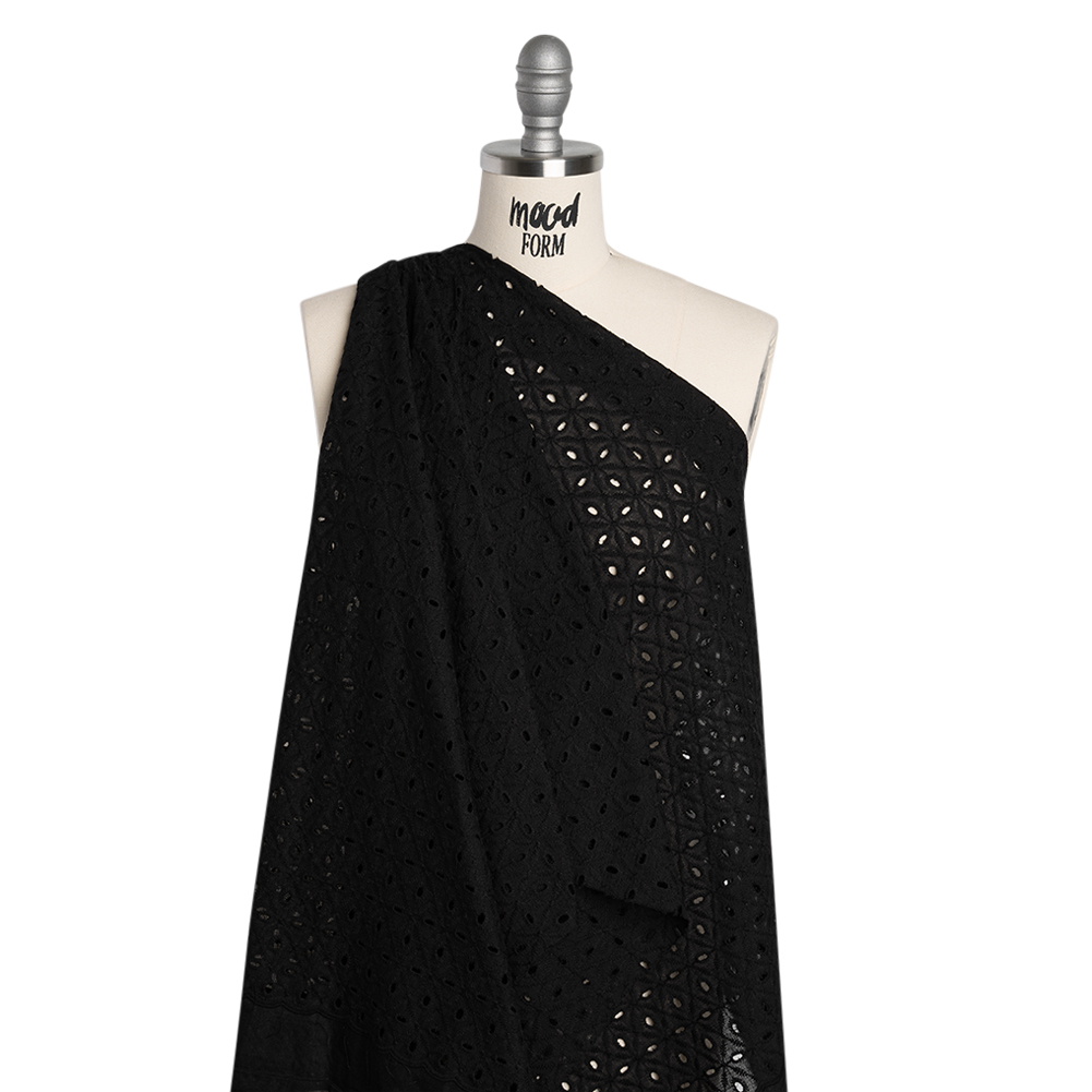 You won’t get oval the lightweight nature of this Black Ovals in Diamonds Embroidered Eyelet Cotton Voile—featuring a dry, tactile hand and crisp, airy drape.