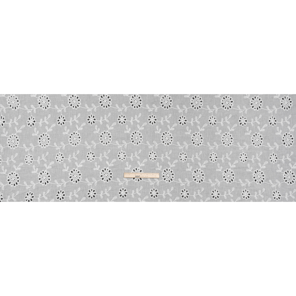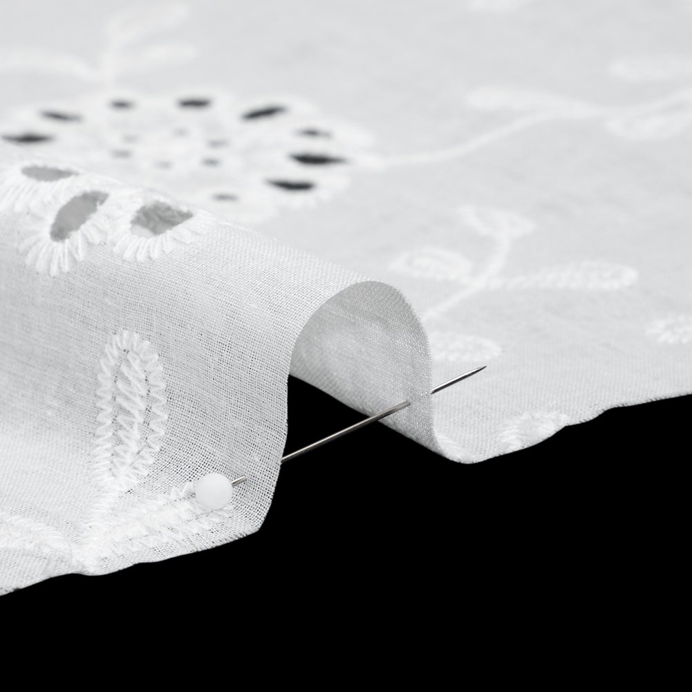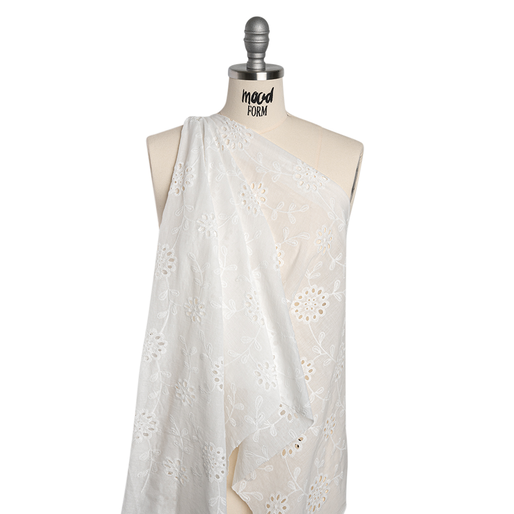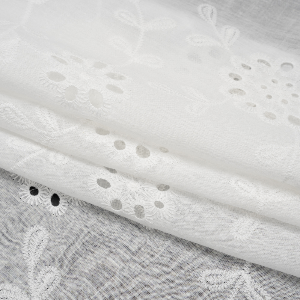Let the light peek through this White Big Flowering Vines Embroidered Eyelet Cotton Voile, featuring a dry, tactile hand and crisp, airy drape.Suggested Projects: Shirts, Skirts, Dresses, ShortsContent: 100% CottonStretch: NoneOpacity: TranslucentBig flowers are embroidered upon this white cotton voile with thick eyelets accentuating their petals—vines connecting the flora. Derived from the French word for veil, voile has a history of gracing romantic occasions with its ethereal sheerness and airy drape. With a dry, tactile hand and crisp yet airy drape, it easily navigates the space between elegance and simplicity. Made from 100% cotton, this naturally breathable fabric is the perfect choice for breezy spring and summer garments—its eyelets further helping you stay cool under the sun. Use it to craft summer dresses, flowing blouses, skirts, tiered maxi skirts, and more! Translucent, a lining may be desired.