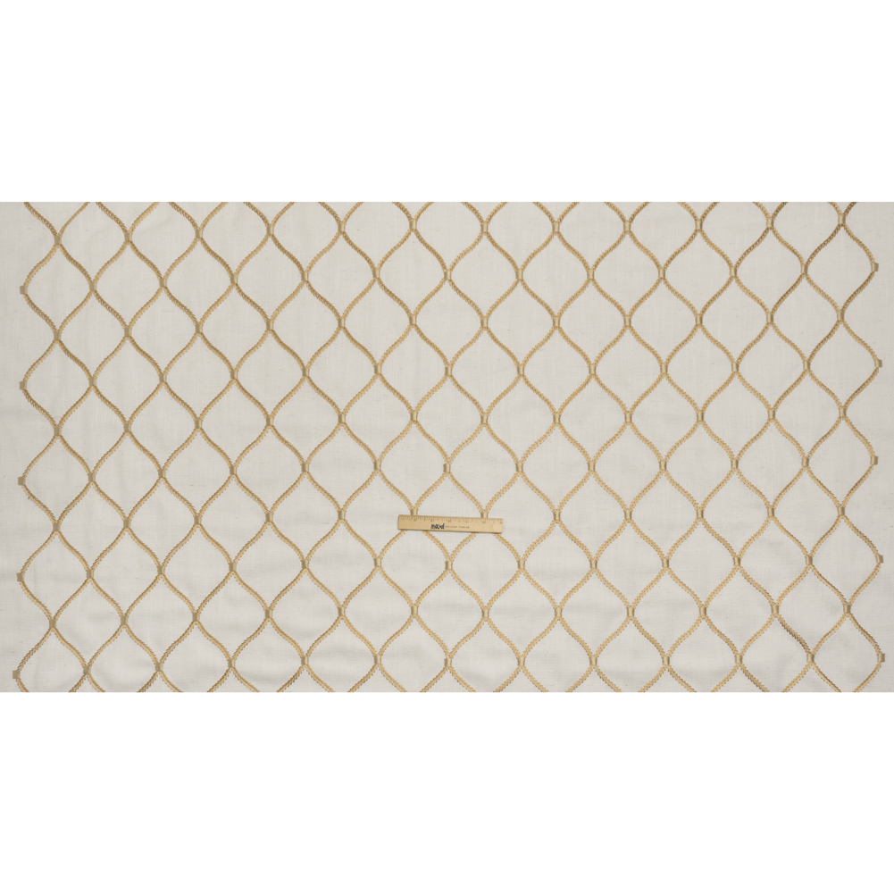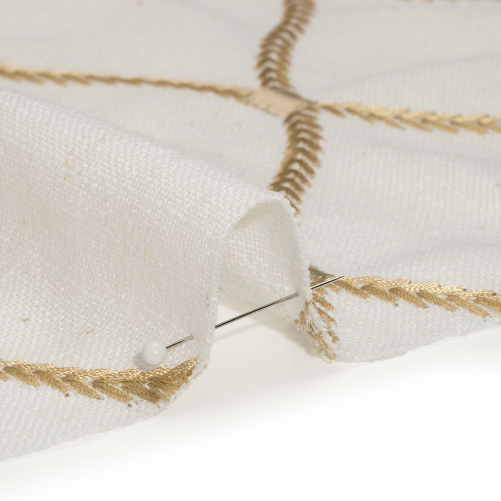 Enjoy your home sweet home with this Honey Ogees Embroidered Linen Blend Woven, featuring a slubbed hand and malleable drape.Suggested Projects: Drapes, Curtains, Throw PillowsContent: 20% Linen, 45% Viscose, 35% PolyesterStretch: NoneOpacity: Slightly TranslucentAn ogees pattern is embroidered in honey brown upon a cream woven. Boasting a visible plain-weave structure, this honey and cream woven with slight variations in hue and flecks of brown promises a soft, tactile hand with a slubbed texture typical of linen, as well as a malleable drape. Ideal for all your home decor needs, fashion pleated drapes and curtains, or create eye-catching throw pillows! Due to its slightly open weave, this medium-weight fabric allows some light through, so consider adding a lining for complete opacity or additional structure. Please note that the embroidery only spans 50 inches of the total 56-inch width.