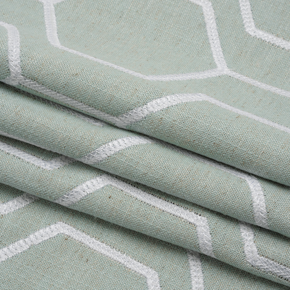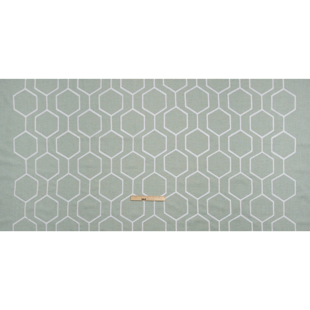 Like gentle waves lapping up onto the shore, this Geometric Embroidered Sea Pearl Linen Blend Woven will ripple in the breeze. Featuring a malleable drape and tactile hand, perfect for breezy drapery.Suggested Projects: Drapery, Light Upholstery, Throw PillowsContent: 45% Viscose, 35% Polyester, 20% LinenStretch: NoneOpacity: Mostly OpaqueA repeating geometric pattern of hexagons is embroidered in white upon a misty aqua woven. Boasting a visible plain-weave structure, this sea pearl green woven with slight variations in hue and flecks of brown promises a soft, tactile hand with a slubbed texture typical of linen, as well as a malleable drape. Ideal for all your home decor needs, fashion pleated drapes and curtains, or create eye-catching throw pillows! Due to its slightly open weave, this medium-weight fabric allows some light through, so consider adding a lining for complete opacity or additional structure. Please note that the embroidery only spans 51 inches of the total 56-inch width.