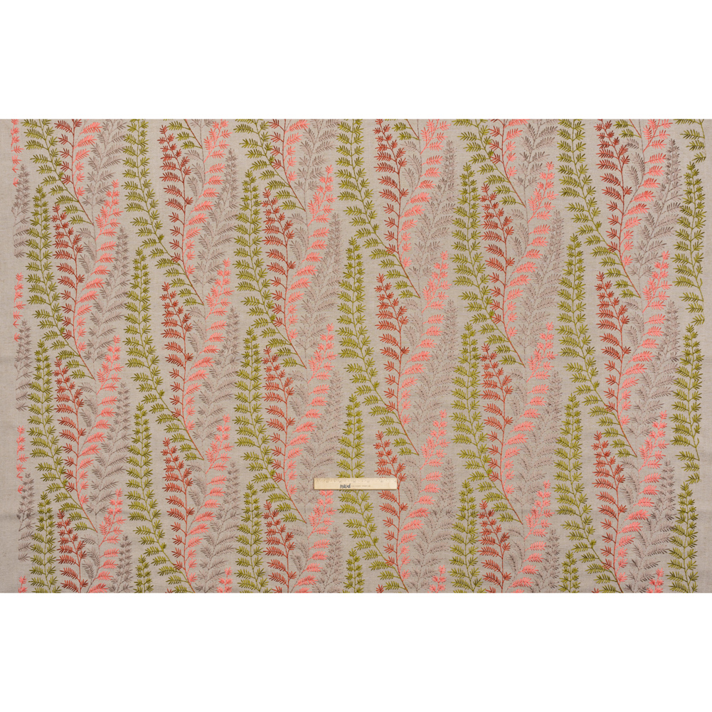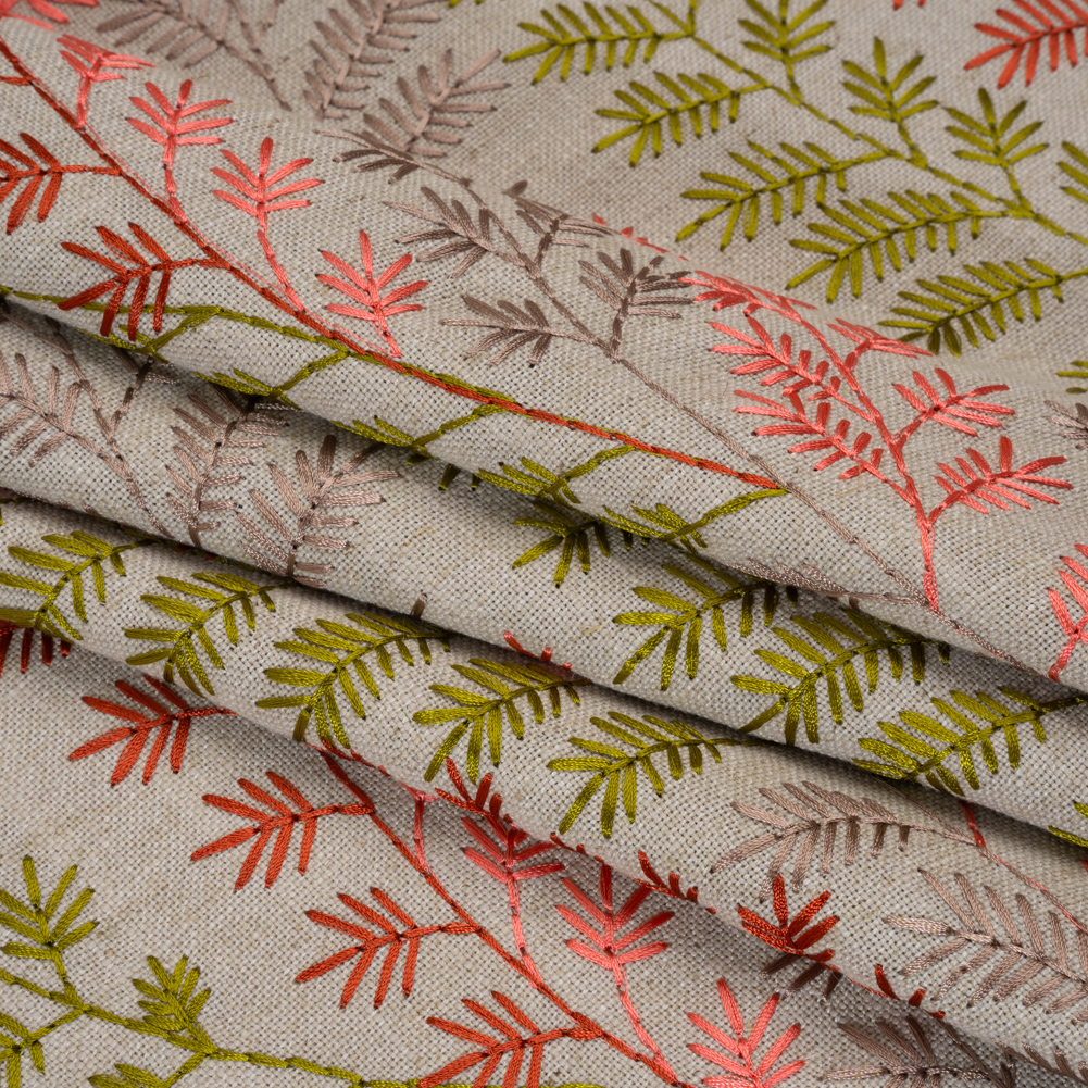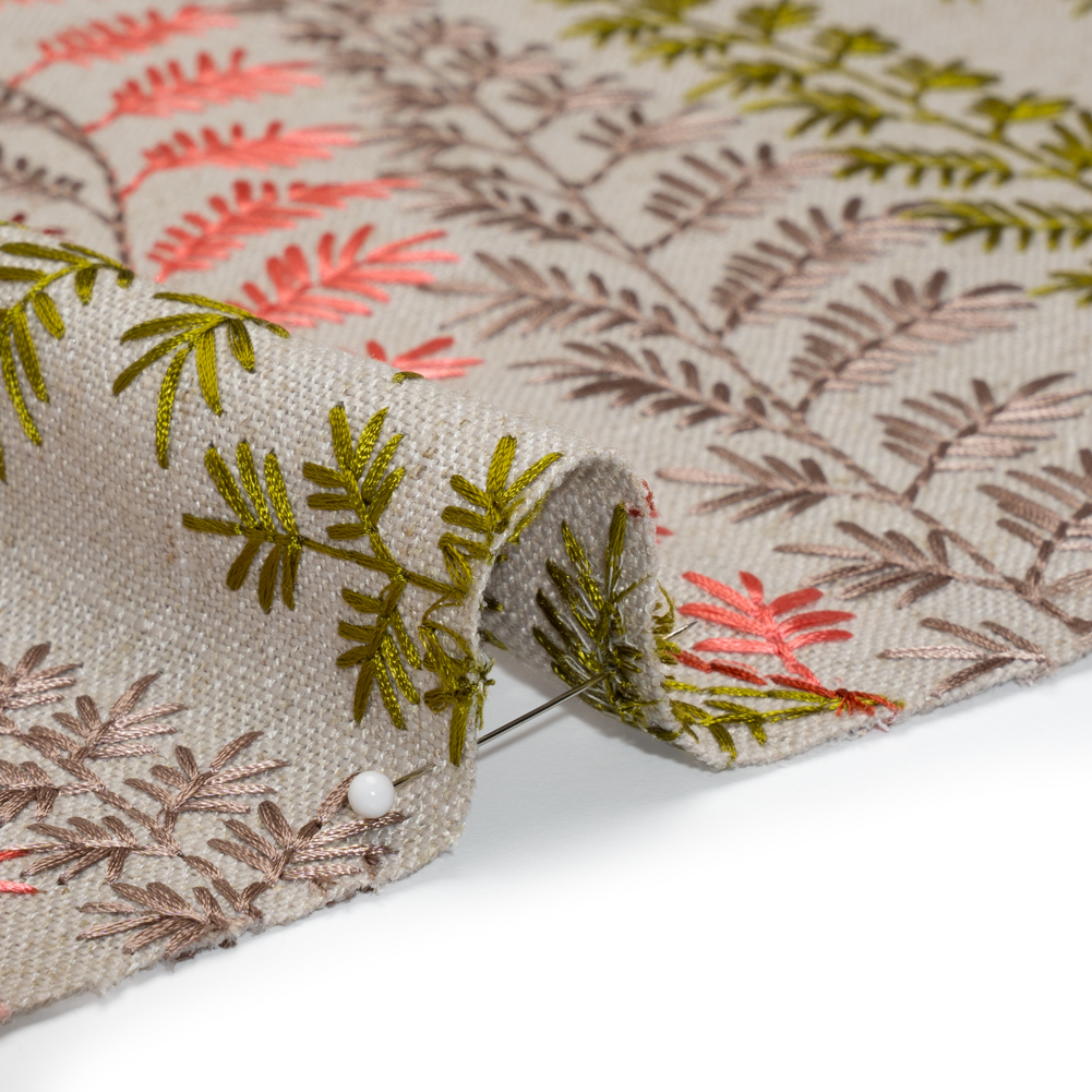 Spring has sprung across this Spring Time Green and Pink Leafy Plants Embroidered Linen Blend Woven, featuring a tactile hand and malleable drape.Suggested Projects: Drapes, Curtains, Throw PillowsContent: 20% Linen, 45% Viscose, 35% PolyesterStretch: NoneOpacity: OpaqueA leafy plant pattern is embroidered in springtime green, coral, red, and mauve upon a light brown woven. Boasting a visible plain-weave structure, this colorful woven with slight variations in hue and flecks of brown promises a soft, tactile hand with a slubbed texture typical of linen, as well as a malleable drape. Ideal for all your home decor needs, fashion pleated drapes and curtains, or create eye-catching throw pillows! Due to its slightly open weave, this medium-weight fabric allows some light through, so consider adding a lining for complete opacity or additional structure. Please note that the embroidery only spans 51 inches of the total 56-inch width.