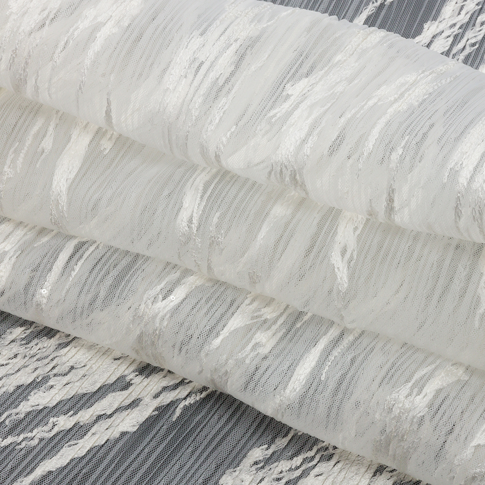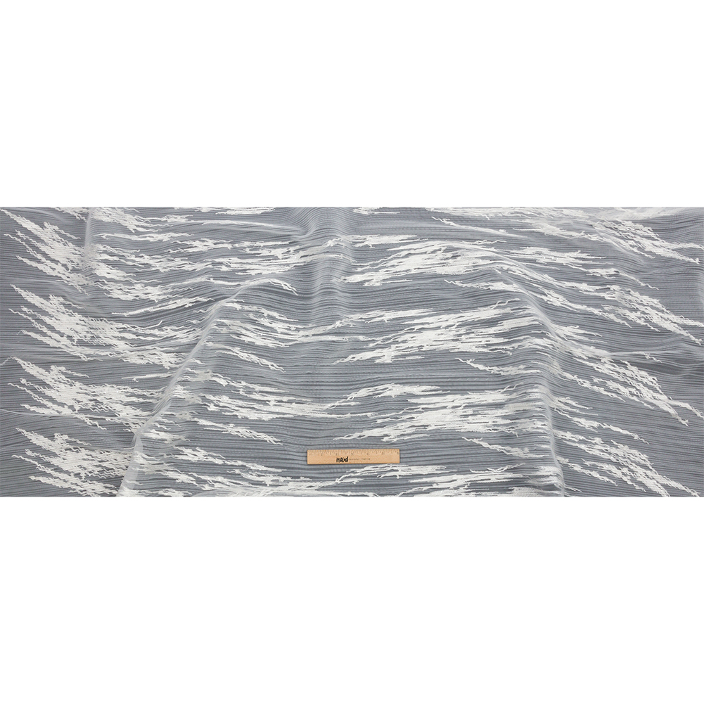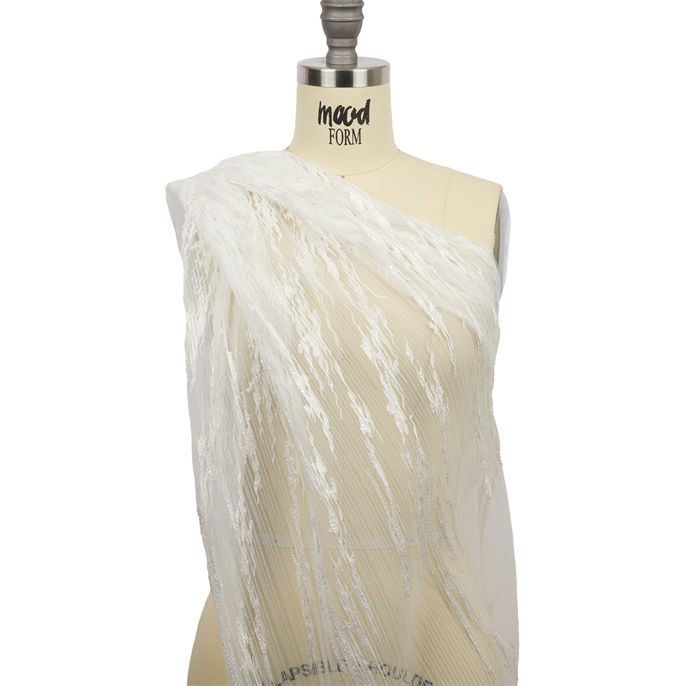 Add an excess of texture to bridal designs with our Linden Off White Abstract Embroidered Soft Pleated Tulle with Clear Baby Sequins. White embroidery takes a sharp and elegant shape over a base of sweet white pleated tulle. Along with a crisp, tactile hand, it offers a notable mechanical give, a semi-structured drape, and so much volume that it'll lift any project from ordinary to extraordinary. Create statement sleeves, gowns with sculptural details, elegant skirts, and so much more. Sheer in part, a lining is recommended where opacity is desired.Please be aware that this pleated fabric is measured and cut with the pleats closed and folded.