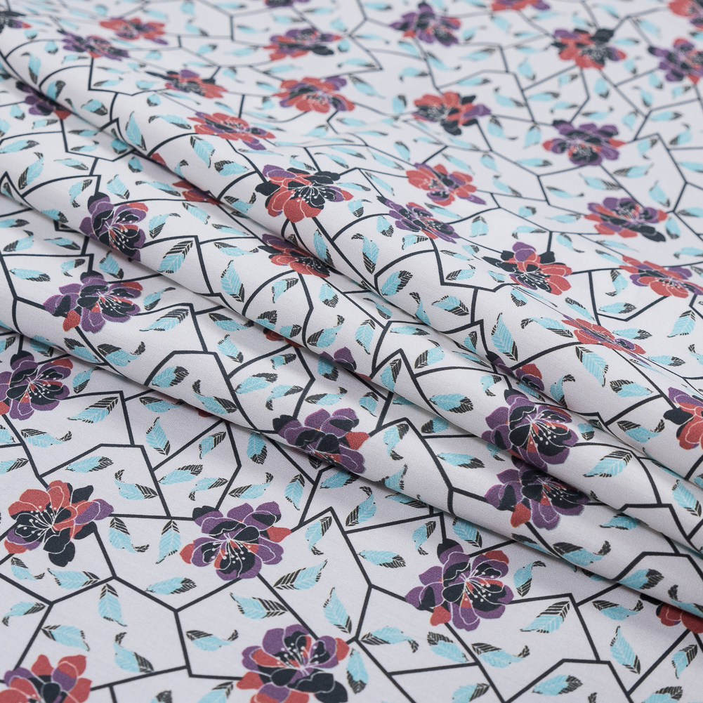Patterns are for play, especially when it comes to this European Red and Angel Blue Floral and Feathered Cotton Poplin! A geometric mosaic featuring falling feathers of blue and black are met with floating flowers in purple and red. Use its flexible drape and smooth hand to create posh looks that air on the side of fun. From midi dresses to shirts and tops, add it to your spring/summer collection. Thin and lightweight, it is translucent and may require a lining in some applications.