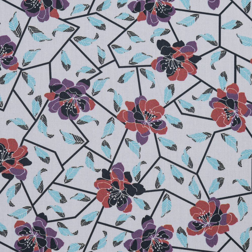 Patterns are for play, especially when it comes to this European Red and Angel Blue Floral and Feathered Cotton Poplin! A geometric mosaic featuring falling feathers of blue and black are met with floating flowers in purple and red.