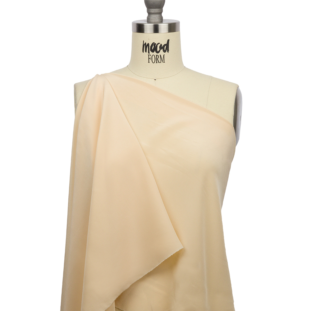 Treat yourself to this sweet Famous Australian Designer Biscotti Polyester Crepe de Chine. A shimmering luster and soft, crepe-like texture take this warm beige material to the next level. With an effortlessly fluid drape and no stretch, create blouses with gathered sleeves, flowing dresses and skirts, or wide-legged pants. Translucent, a lining may be added for opacity and structure where desired.