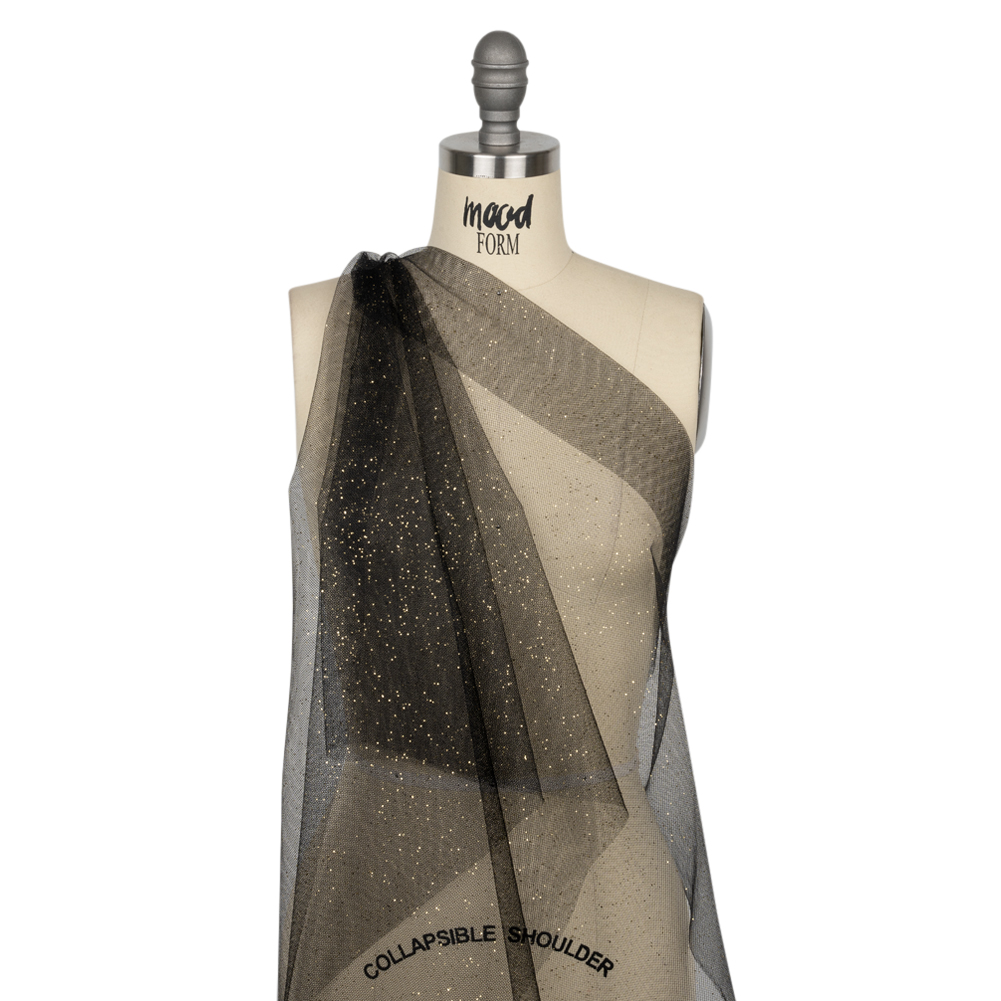 Elegance deserves to be shouted from the rooftops; this Famous Australian Designer Black and Gold Glitter Speckled Tulle agrees! A black netting yields a coarse hand and semi-structured drape, peppered with golden glitter that resembles stars in the sky.More than just a fabric for the stage, tulle mixes high-brow culture with current trends to provide you with the versatility to turn up or down the volume of your garment—literally. From ballerina-status tutus to ethereal silhouettes, tulle creates style statements as magnificent as an orchestral crescendo or as delicate as an aria. Fashion tiered dresses, voluminous gown underskirts, blouses with structural sleeves, and more.