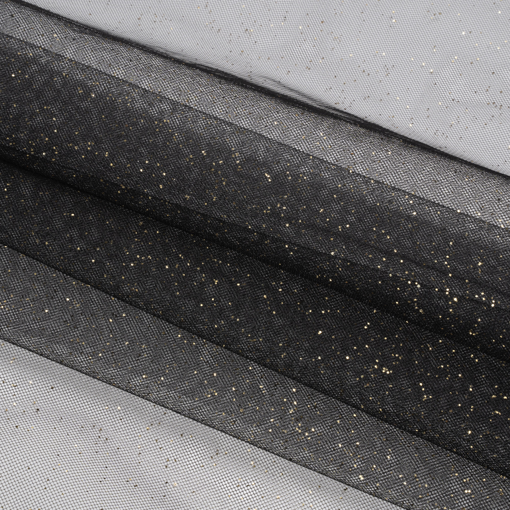 Elegance deserves to be shouted from the rooftops; this Famous Australian Designer Black and Gold Glitter Speckled Tulle agrees! A black netting yields a coarse hand and semi-structured drape, peppered with golden glitter that resembles stars in the sky.