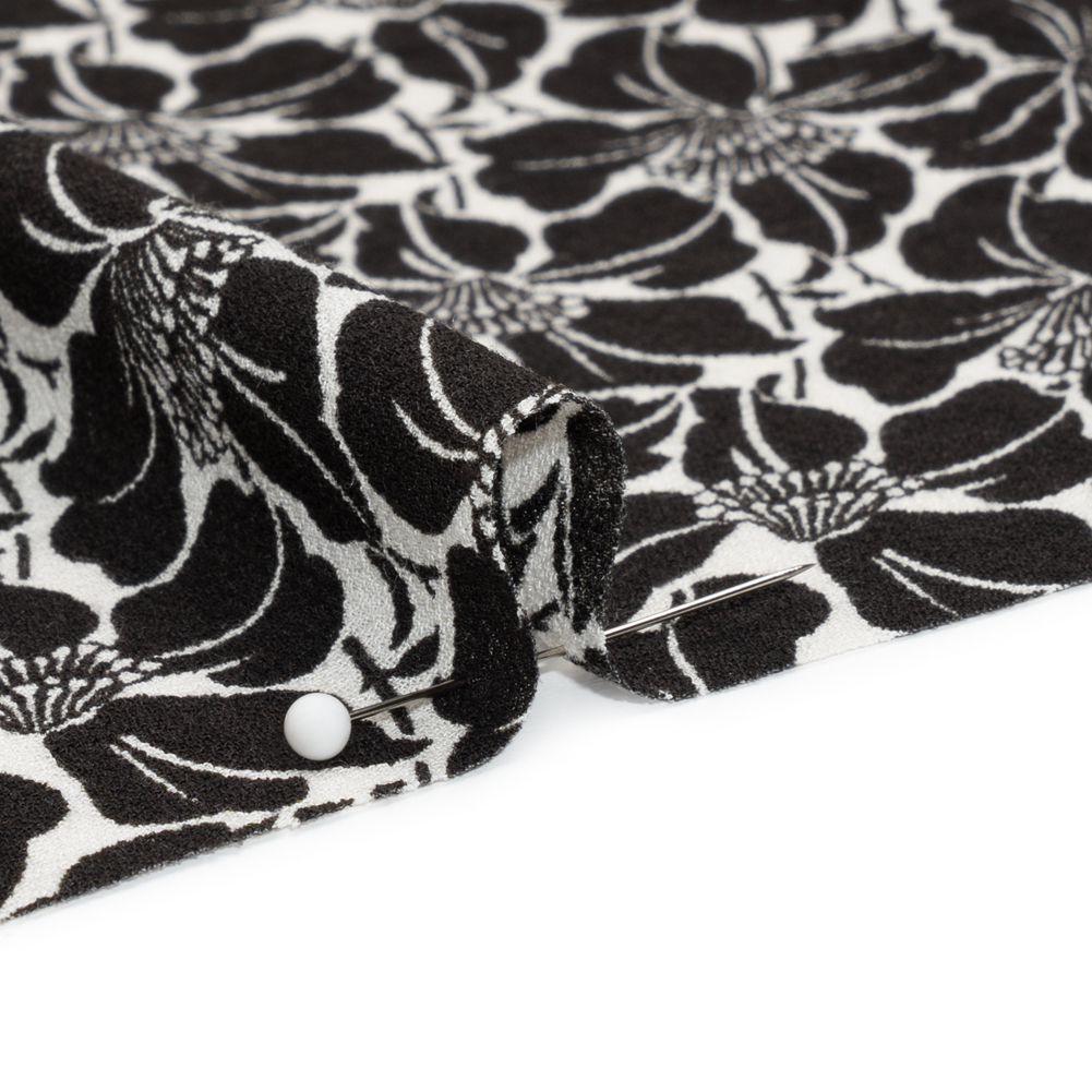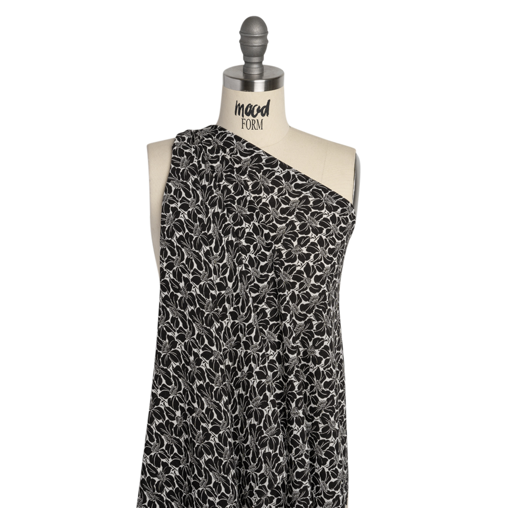 Let this Famous Australian Designer Black and White Floral Rayon Crepe fit your fancy! In contrast with the white backdrop, black flowers create a simple yet striking scene on the tactile face.