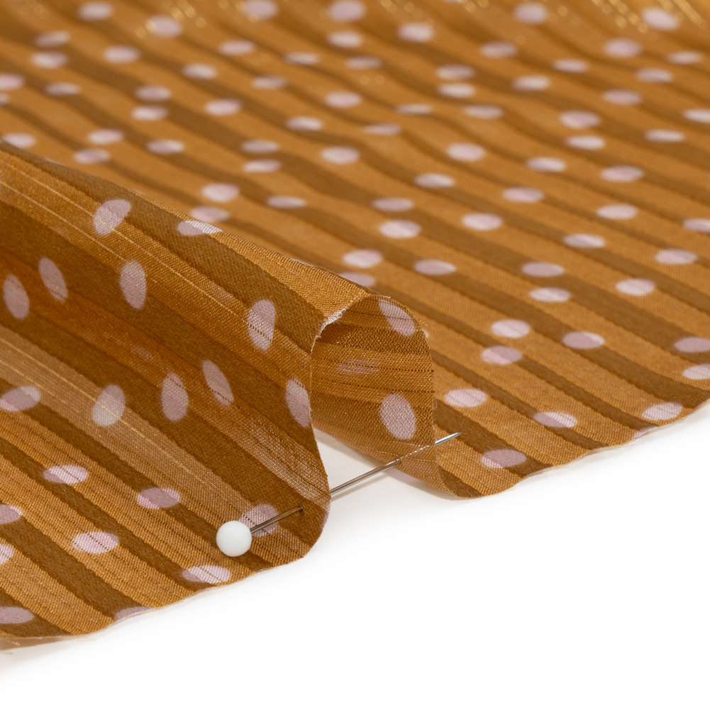 Play around with this Famous Australian Designer Brown and Pink Polka Dot Silk Burnout Stripe Satin with Metallic Pinstripes, featuring a warm tan ground and a smattering of pale pink polka dots.
