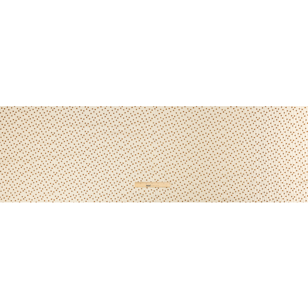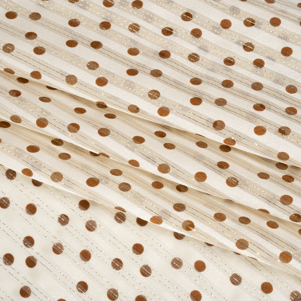 Elevate your whimsical aesthetic with this Famous Australian Designer Cream and Brown Polka Dot Silk Burnout Stripe Satin with Metallic Pinstripes, featuring a cream ground and a smattering of brown polka dots.