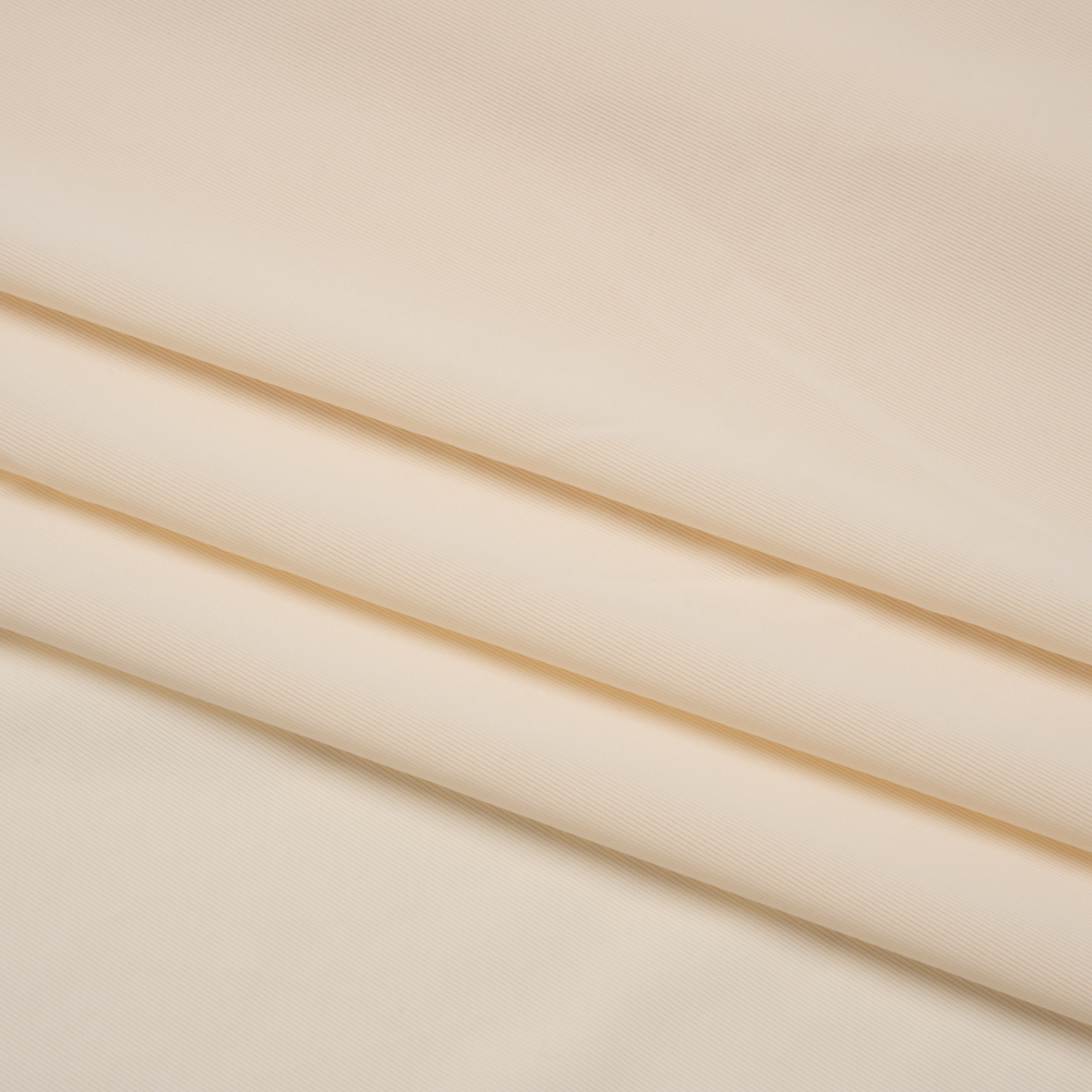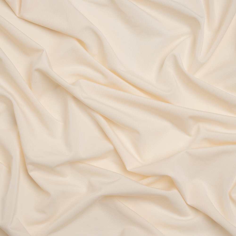 Seek a comfortable style with this Famous Australian Designer Cream Stretch Polyester Jersey. The luster and sleek hand romanticize your casual mornings and bring comfort to your active days, seamlessly adapting to your body's every move with a 60% warp-wise stretch (with a slightly less stretch through the weft). The fluid drape and cream coloring provide style versatility, allowing you to embrace a sporty look with biker shorts, exude confidence in bodycon dresses, or unwind in bralettes and flared leggings. Please note that this fabric is translucent.