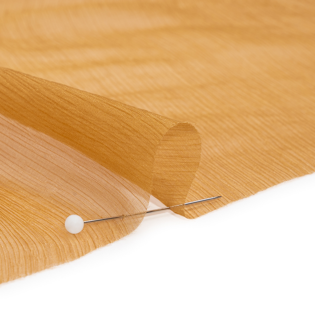 Dream a little dream of this Famous Australian Designer Gold Crinkled Silk Chiffon. Made of 100% silk, this golden tan fabric owns the softness of an angel and the airiness of a cloud. Paired with a subtle luster, the barely-there weight casts an ethereal allure over your formalwear garments as the slightly wrinkled hand contributes a hint of visual intrigue. Dream of skirt overlays, sheer blouses, evening gowns, and more! A lining may be desired depending on the project.