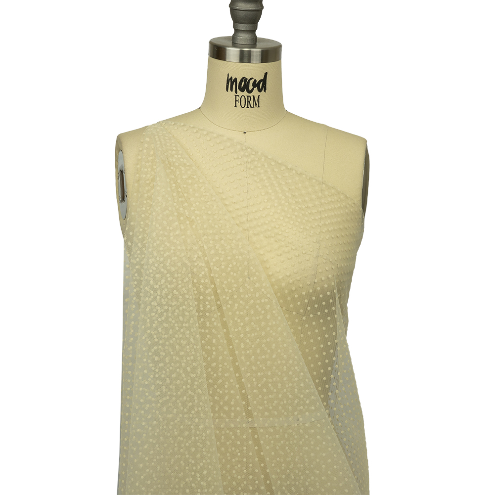 The world is your oyster, so why not get caught wearing it with this Famous Australian Designer Oyster White Flocked Polka Dots Point D'esprit! A crisp ivory tulle ground bears fuzzy flocked dots and a slight all-way mechanical give. The malleable but voluminous drape allows you to create striking sleeves for dresses and blouses, tutu skirts, and more. Sheer, a lining can be used for modesty where desired.