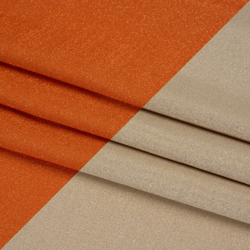 Fashion statements are what this Famous Australian Designer Persimmon, Beige and Metallic Gold Double Face Stretch Polyester Tricot does best. Metallic gold threading textures the sleek surface with a slightly grainy feel, instantly glamorizing the comfort of the 60% all-way stretch and fluid drape with an intoxicating brilliance. The bright orange face and cream reverse push you to explore dual-toned creations and reversible garments; have fun fashioning bodycon dresses, flared leggings, and biker shorts that are uniquely you.