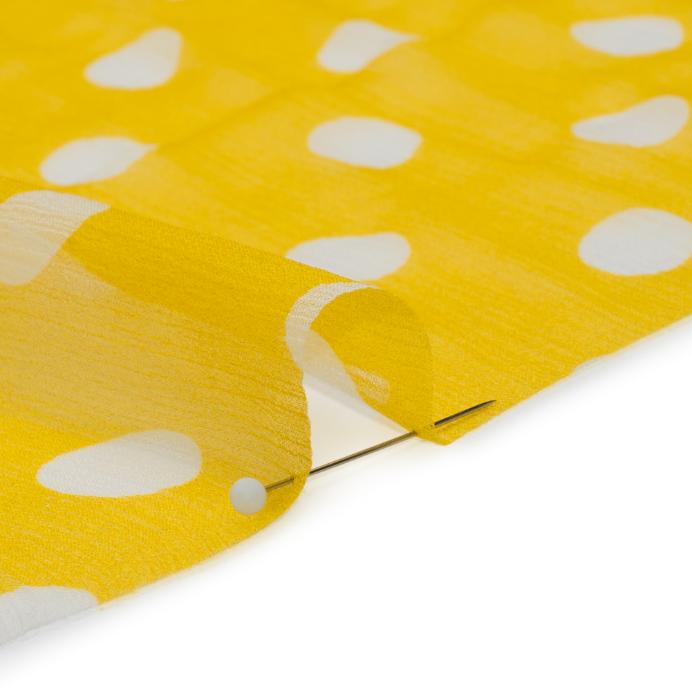 Keep a playful attitude alive with this Famous Australian Designer Yellow and White Polka Dot Crinkled Silk Chiffon! The crinkled face is made of 100% silk, as bright as the summer sun and spotted with white polka dots.Romanticize any silhouette with silk chiffon’s sheer quality and airy drape. A slightly tactile hand accompanies this ethereal fabric, inspiring floor-length gowns, dusters, blouses with ruffled sleeves, scarves, and more. A tip from our sewists: do not feel intimidated by sewing this delicate fabric; using a rotary cutter (or sharp scissors and sharp pins), fine needles, tight stitching, french seams, and patience, anyone can show up to a special occasion wearing a silk chiffon garment they created themselves!