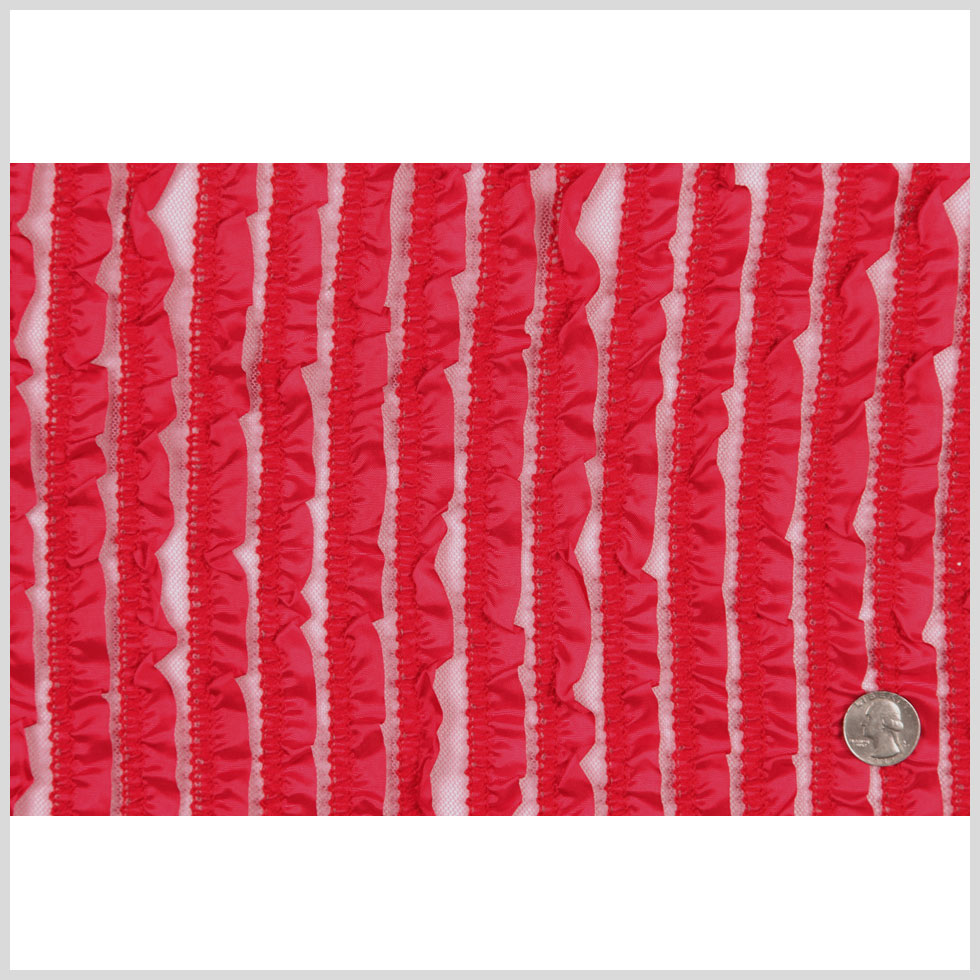 Oh, so cute and undoubtedly adorable, check out this Famous Designer Red Ruffled Lace! Mood presents a soft pink tulle topped with stripes of red satin ruffles. Each ruffle is 3/4" wide and creates texture throughout the piece. It has a flexible drape that transforms easily into children's tutus, skirt overlays, and costumes! Thin and sheer, insert a lining for more opacity.