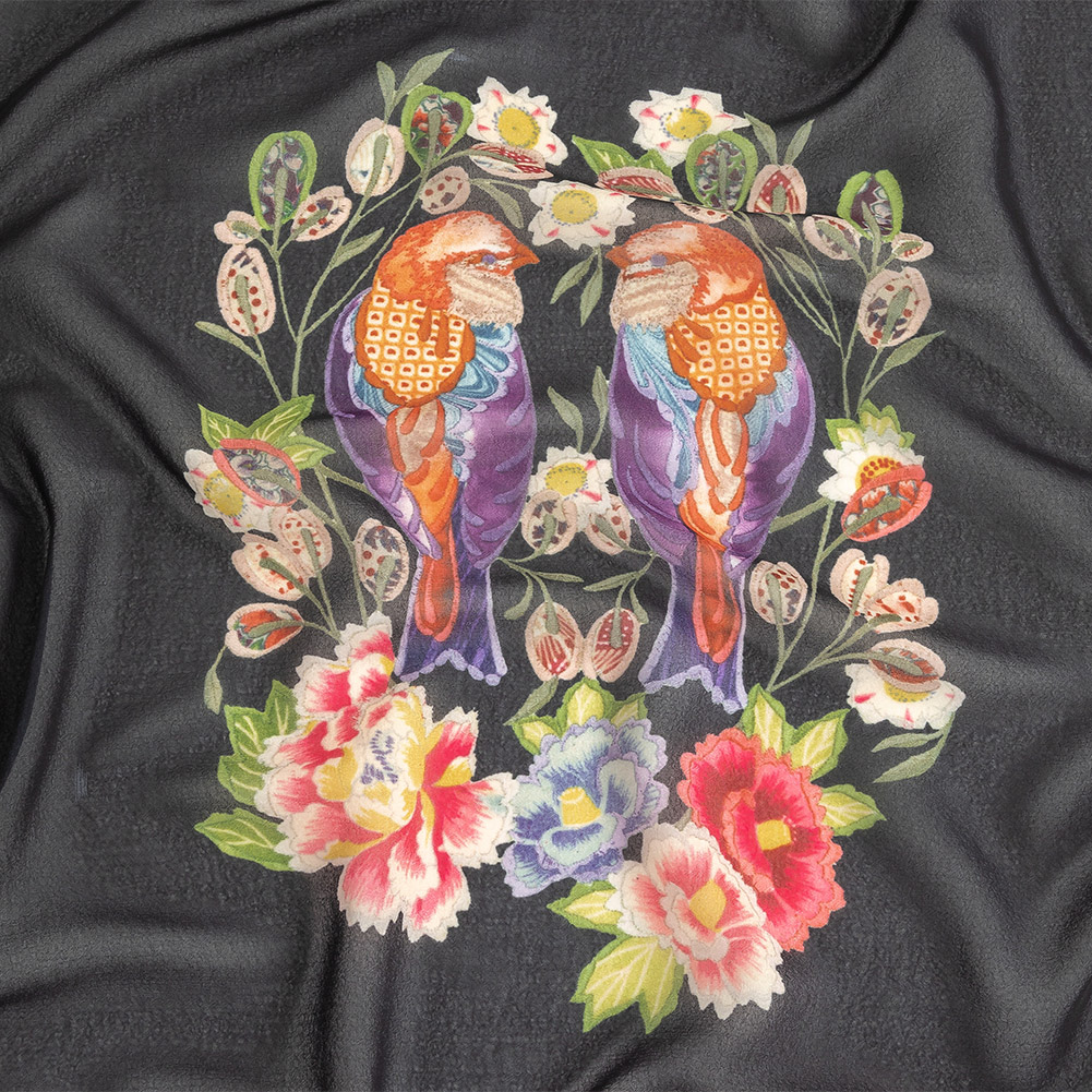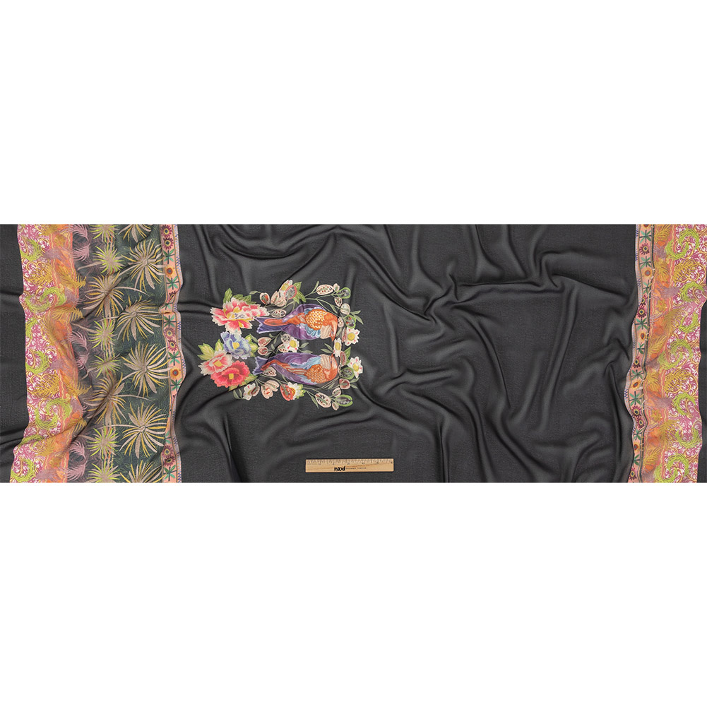 Famous NYC Designer Black, Pink, and Green Lovebirds and Florals Polyester Georgette Panel