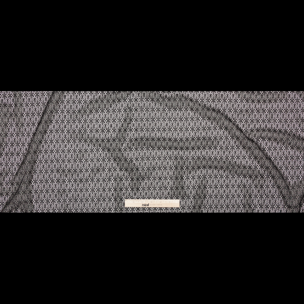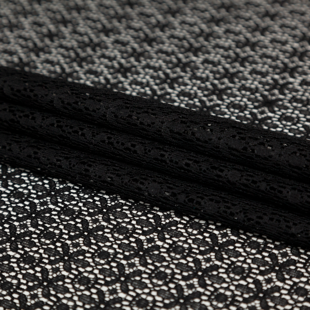 Presenting Mood's Famous NYC Designer Black Stretch Floral Lace, lovely and light, a versatile textile ideal for couture gowns and casual dresses. Geometric flowers interlock like building blocks, blooming and folding along the surface that features a subtle sheen and a textured, soft hand. Parallel to one selvage, a scalloped border asserts itself in an embroidered manner, transitioning from about 3/4" of netting that can be carefully cut away, providing a finished scalloped edge to your design. With a 25% weft-wise stretch, create body-conscious dresses that cradle the curves, fitted crop tops, or pencil skirts lined with satin using its fluid and quickly falling drape. Translucent with open pockets of space, a lining is recommended for increased opacity. Please note, this fabric weighs 93 GSM.