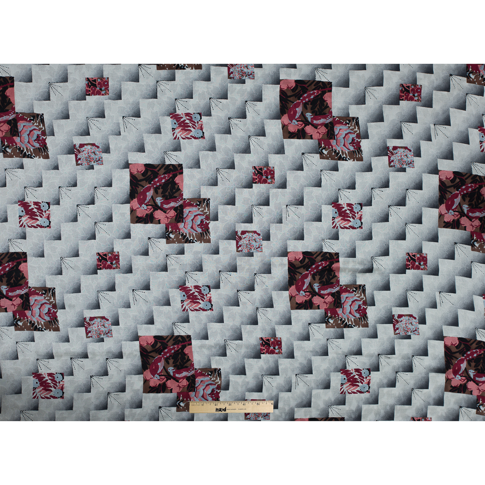 Last seen on a spring runway in 2014, this Famous NYC Designer Printed Silk Woven is eccentrically composed of a unique print and pattern for the divine eye. Patches of floral bird designs are scattered over a gradient zig-zag. Variations in the gauge of the weave result in an inlaid floral pattern throughout the fabric. Thin and sheer, this silk has an absolutely lovely drape. Create whimsical pieces such as floor length dresses and flowing tops. Lightweight and sheer, this fabric may require a lining based on preference.